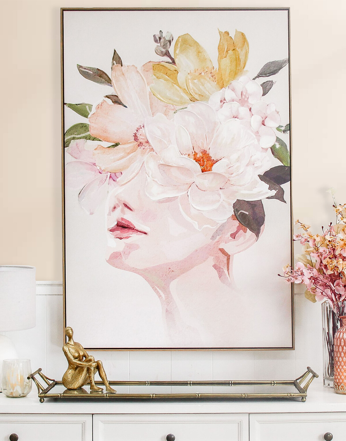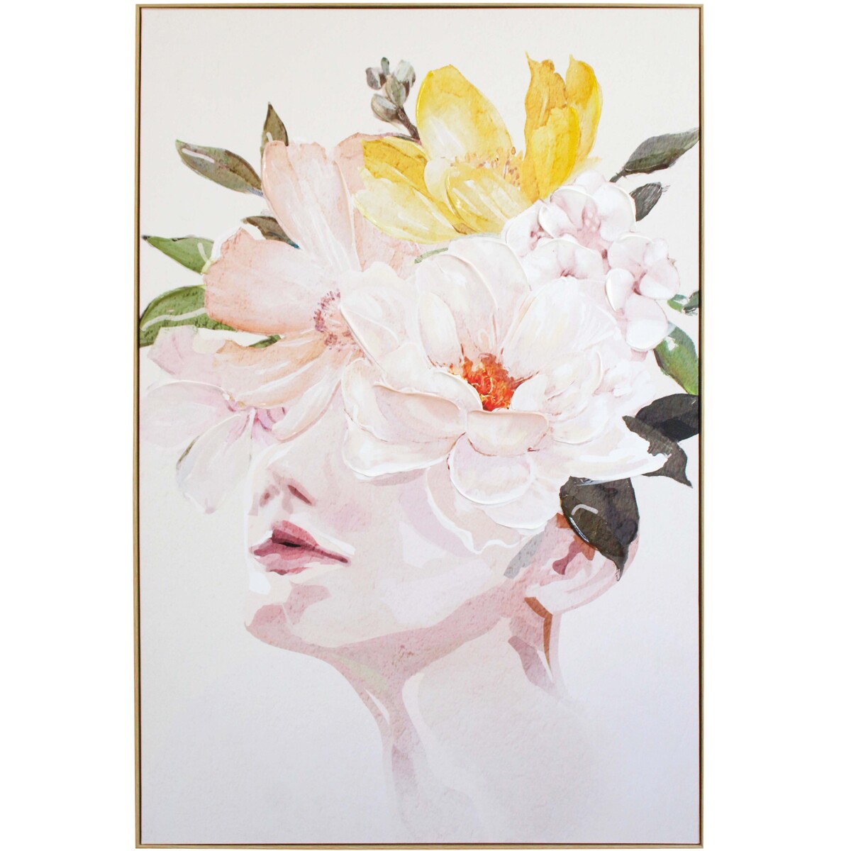 Delight in the tranquil visage of the Framed Canvas Florence, where delicate floral motifs merge harmoniously with the soft silhouette of a serene figure. The colour palette is a gentle mix that seamlessly blends with a variety of decor styles, from the modern minimalistic to the classic and traditional. The hand-finished paint or gel adds a layer of texture and depth, ensuring that each piece is distinctively different and exquisitely unique.