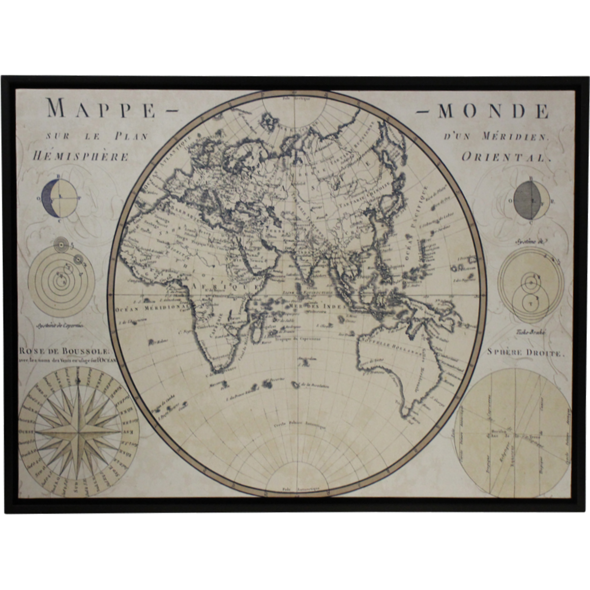 This stunning World map canvas will add personality and style to the walls it adorns and brings a sleek sophistication and chic flair to your surroundings. It showcases an antiqued world map motif having details like the measurement of latitudes and longitudes, planetary system, etc. in French typography. A popular choice among map enthusiasts, this wall art gives an interesting and stylish appearance along with bringing a certain touch of style to your interiors.