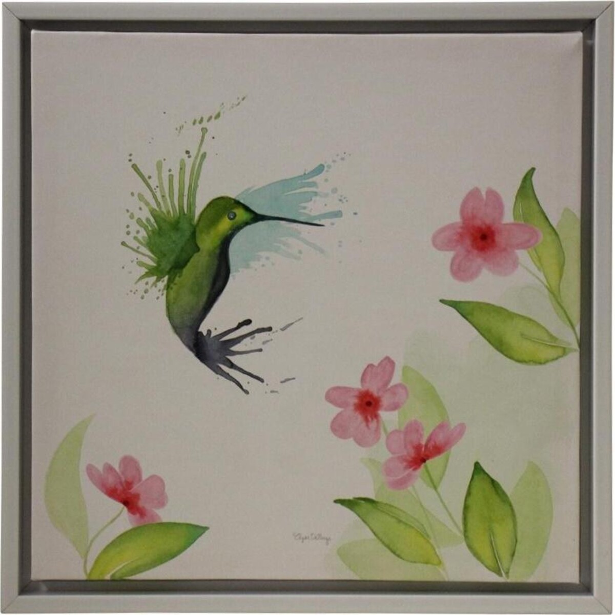 A beautiful composition that is both refreshing and relaxing, it gives you the feel of being with nature and looks like the artist just painted it. The colours are vibrant and vivid with splashes of paint to create the grey tail and the light blue and green wings, nicely depicting the fast movements in which this bird flaps its wings. This vibrant botanical scene will add some colour and texture to the wall it adorns and brightens any room that it is hung in. You can hang this as wall art in the sun lounge or solarium and it is a great gift for a bird lover or nature enthusiast!