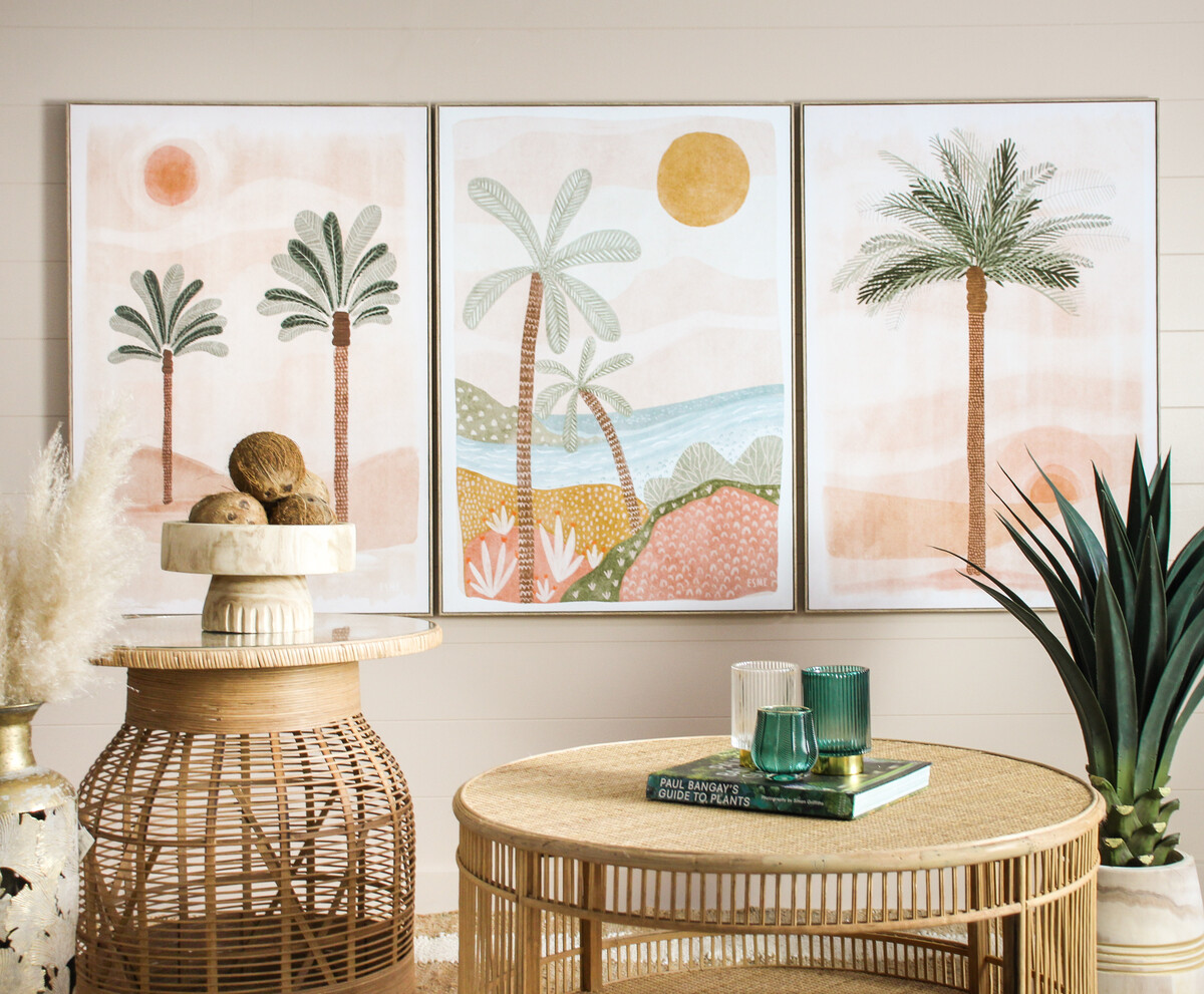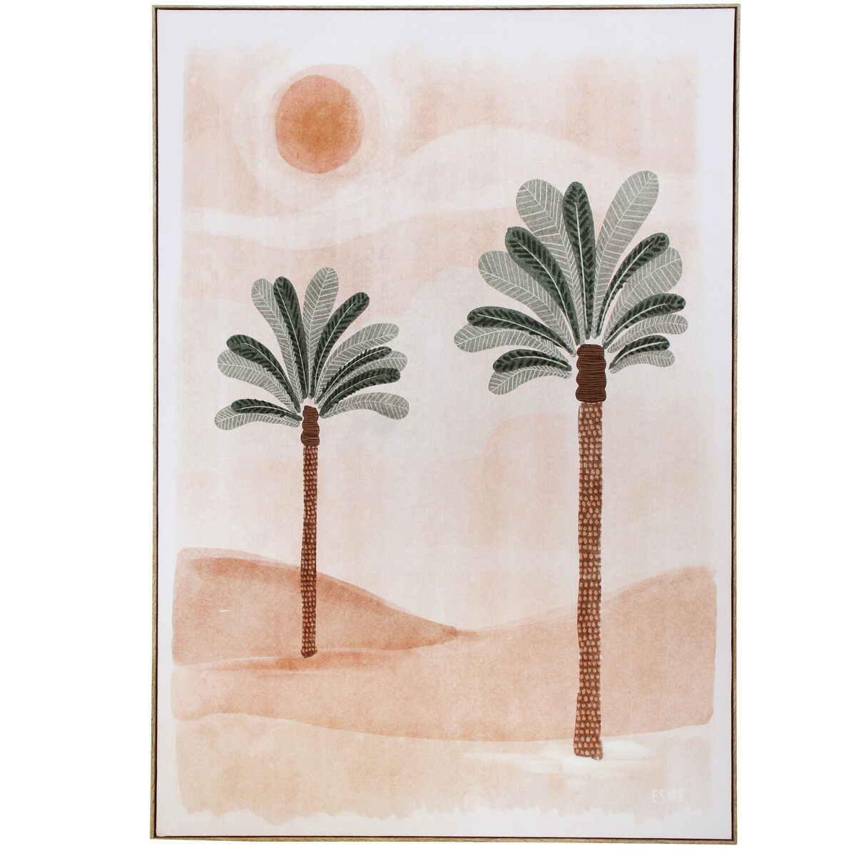 The Framed Canvas Oasis 1 is a decorative statement which would be perfect for use in transforming the visual and overall decorative atmosphere of spatial settings. The vertically inclined artwork is made through the use of premium quality canvas material, high grade resin and framed on all four sides using all-natural, bio-degradable pine wood. The artwork showcases two palm trees standing a bit apart from one another with sand on the ground and the sun shining brightly in the horizon.