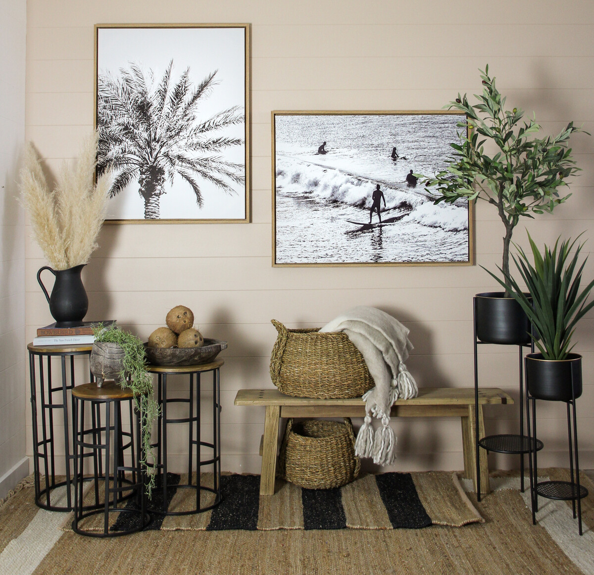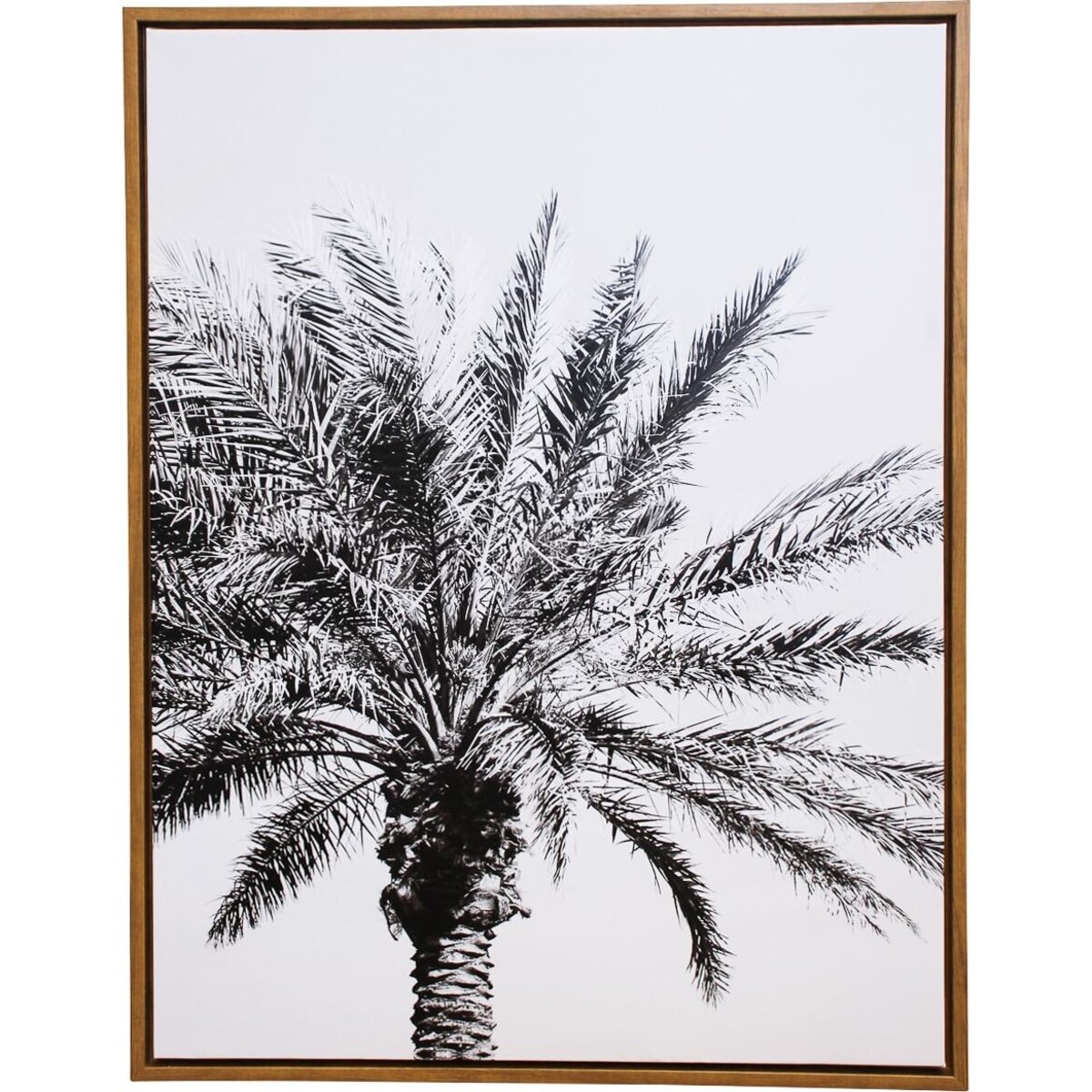 Featuring the image of a single palm tree in a somewhat black and white vintage retro, this artwork is both classic and ornamental. The artwork particularly focuses on the head of the tree and its branches by presenting a close up image of the palm tree rather than the full image of the whole parts of the tree. Given its appealing cool choice of palette, this Framed Canvas Palm View would be perfect as a means of complementing most decorative ambiance.
