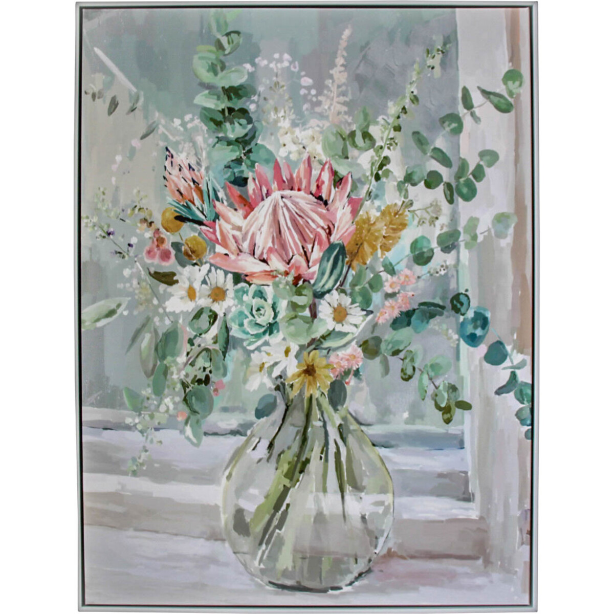 Bouquet has been in existence for centuries. Such colourful assortment of cut flowers are often used for special occasions such as weddings, birthday parties, anniversaries, graduation ceremonies and a host of other festive occasions. The Framed Canvas Pretty Bouquet is a pretty picture of a bouquet of flowers reproduced in pastel shades of pink, yellow and green. The focal point of this bouquet is the protea flower which is creatively painted as being at the centre of the bouquet and having the conspicuous pink blossom. This artwork would be suitable for those looking forward to introduce a calm decorative effect into their living spaces.