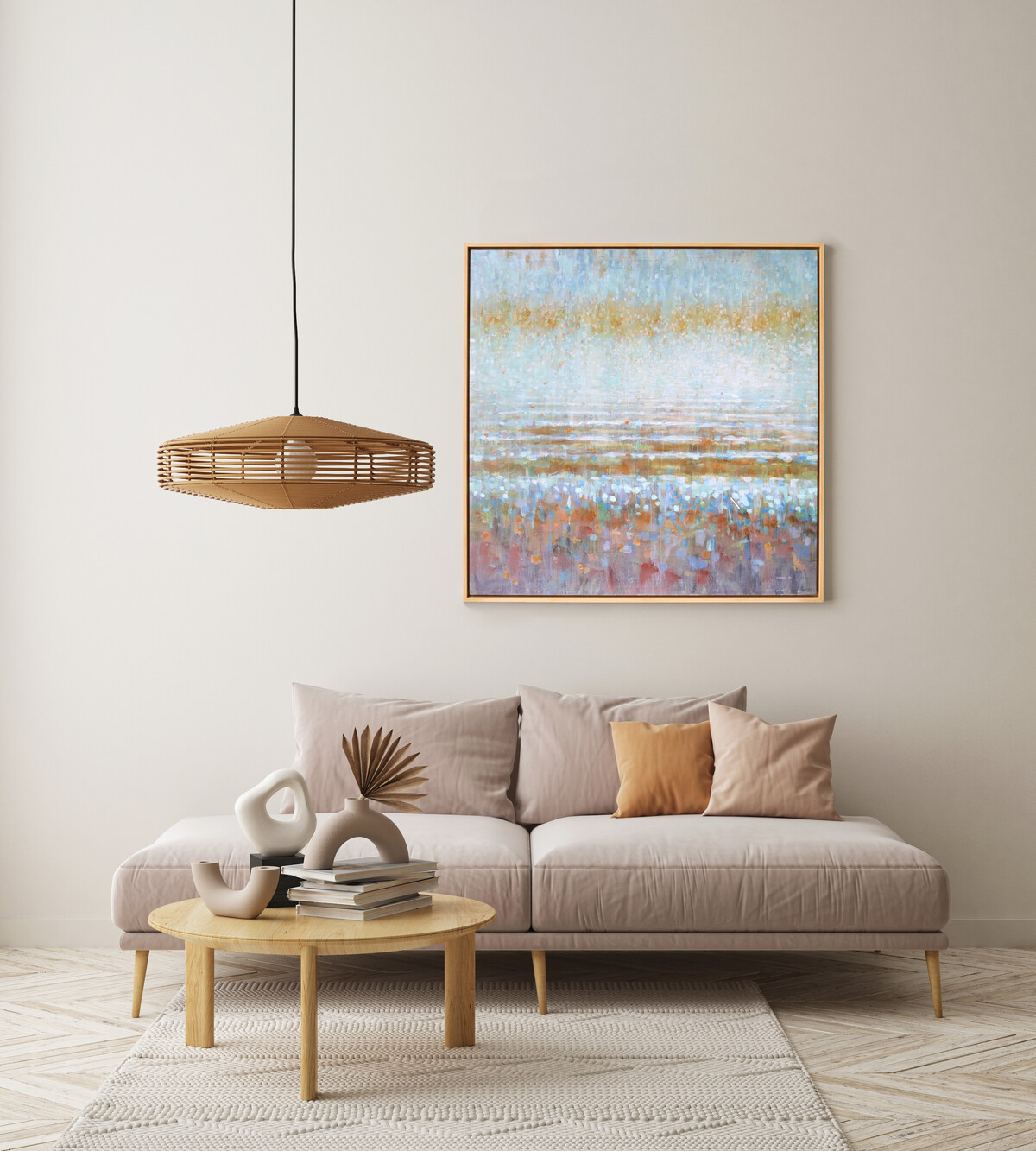 You know when you discover a piece that just feels alive with movement and mood? That's exactly what we're seeing in our Framed Canvas Rain Mustard. It’s as if someone’s pressed pause on the most beautiful rainy afternoon, and this is what’s left – all soft edges and that gentle mustard haze fading into cool mist. This one’s big at 100x100cm but still subtle, with its hand-finished paint effect. Each one does come out a bit unique. Some have more of those moody mustard accents, while others pick up more blues or a touch of something lighter. It all just works together.
