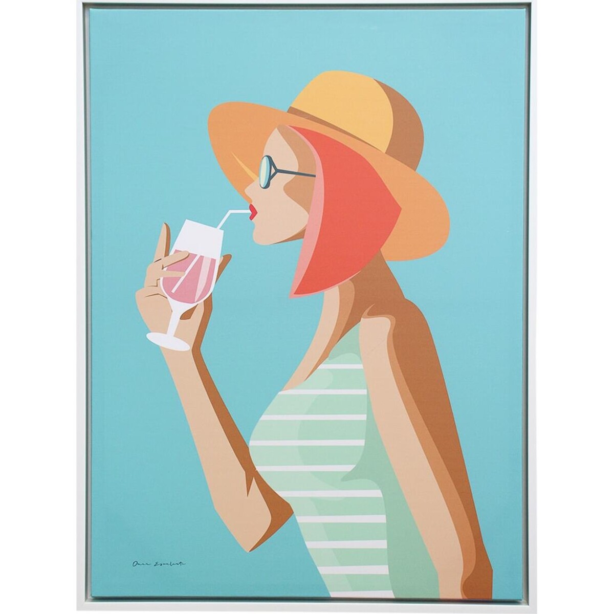 The Framed Canvas Retro Summer 3 is a set which consists of and is sold as a set of three artworks which share some similarity in artful design and appeal, but so also do they differ from one another due to slight variations in artistic presentation and thematic preoccupation. The first framed canvas features a woman seeping her cocktail with wide brimmed hat to shade her face from sunlight. The second abstract print painting also showcases a woman with her back to the calm sea. The third painting in this set however features a woman in gown posing on her bicycle.