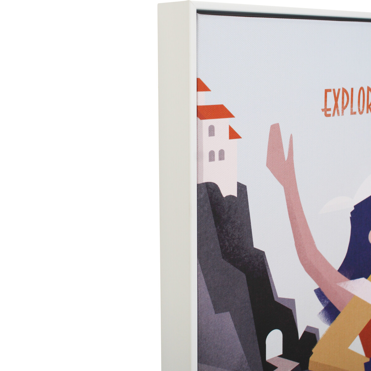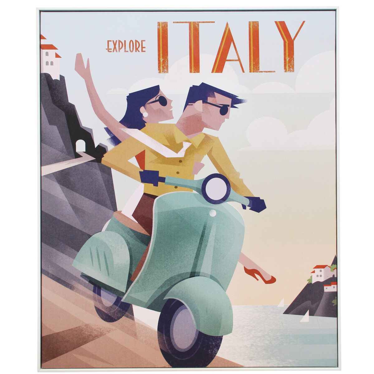 The Framed Canvas Road Trip is a fabulous addition to our collection of printed artworks on famous cities and countries. This particular one showcases one of the most famous vacation destinations in all of Europe – Italy! With Italy having the highest number of UNESCO world heritage sites numbering about 50, it is no wonder that it is a popular destination for fun seekers on vacation or holidays. It depicts an abstract man and woman taking a road trip on a scooter.