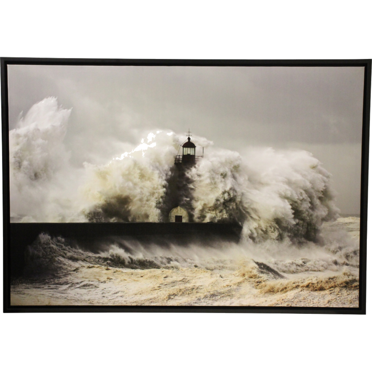 Bring the energy of the stormy sea into your home or business with this wall art that has a scene of a lighthouse overlooking the rough seas as the waves crash onto it. The neutral colouring of deep blacks, whites and browns with everything in its place, makes it the focal point of any room or office.