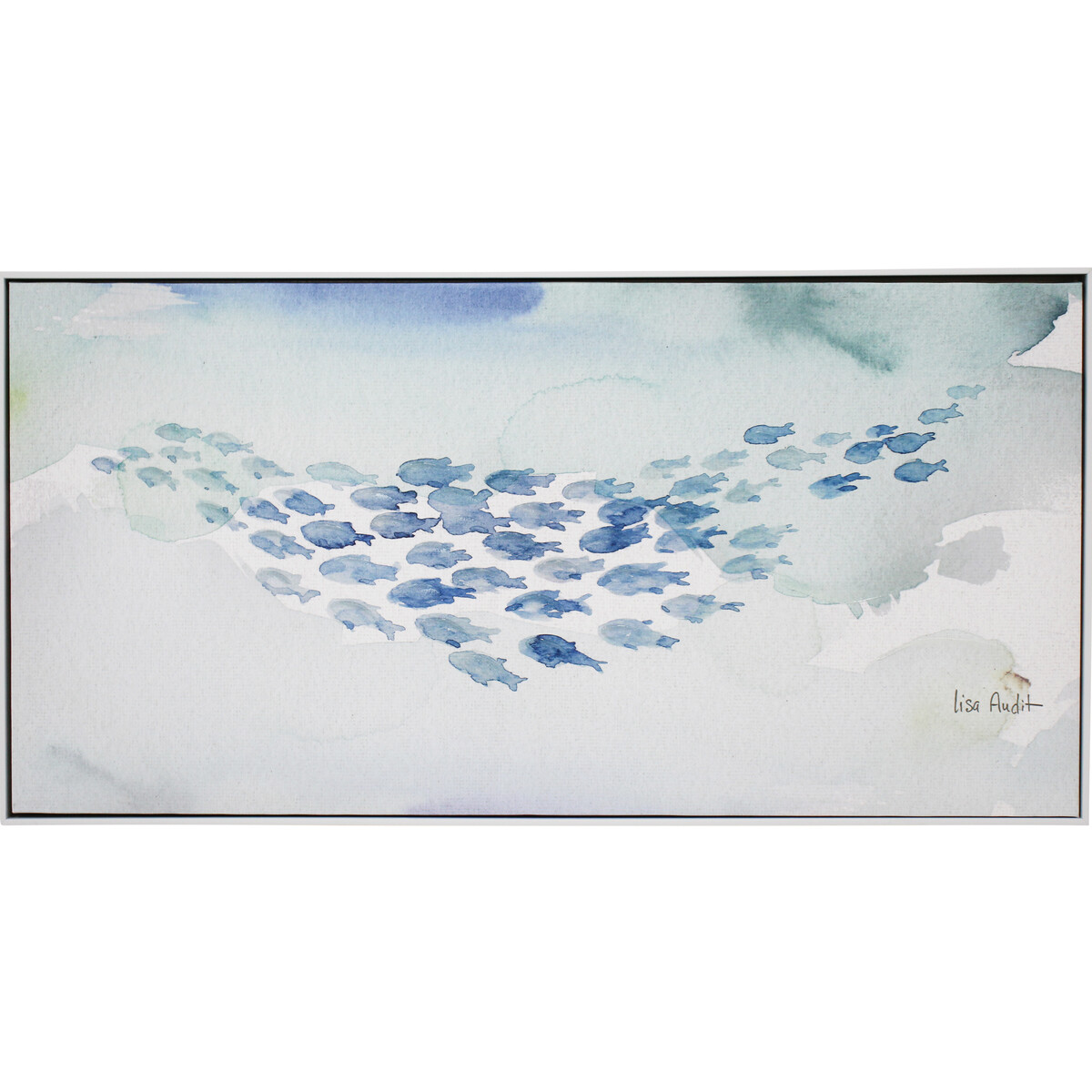 You probably already know that a large group of fish is often referred to as a school of fishes. But, that collective nomenclature does not in fact, refer to all groups of all fish species. Some other groups of fish go by other nouns such as a troop of dogfish, a glide of flying fish and even a swarm of eels. Be that as it may, it is the diversity of fish groups that inspired this ornamental painted canvas artwork tagged Framed Canvas School. The painting showcases the depiction of a group of fish consisting of several individual fish members. The fish range from deep shades of blue to pale shades of green.