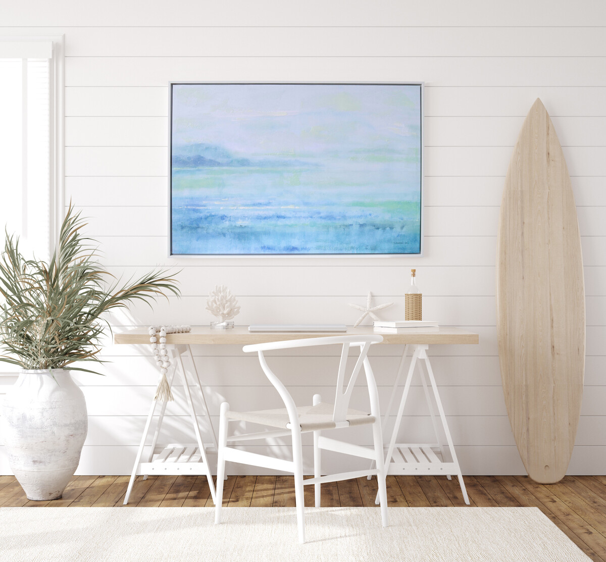 The Framed Canvas Sea Sparkle 2 is quite a mesmerising piece. We think it’s the kind of wall art that draws people in but manages to keep things feeling cool and calm. The colour palette alone makes it a breeze to pair with so many different decor styles - from coastal and beachy, through to modern minimalist or even Scandi-inspired. The gentle blues, greens and softest haze of lilac give off the same feeling as a summer morning by the sea. It’s not an overstatement when we say this canvas is truly versatile.