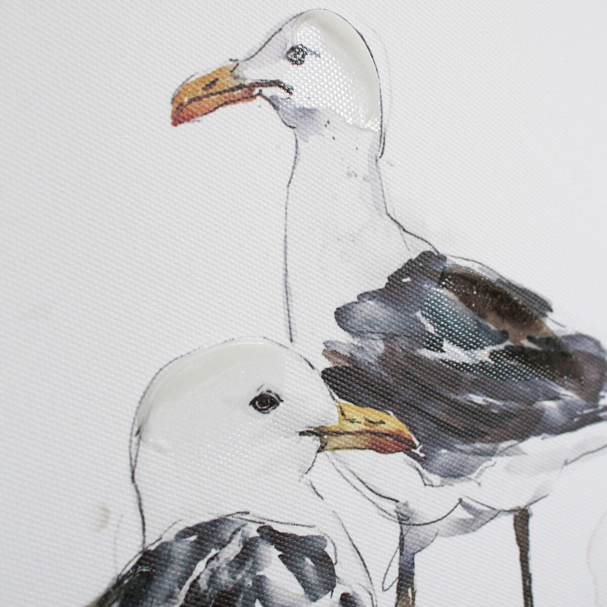 Crafted with care on high-quality canvas and set within a sturdy pine frame, this artwork features a charming assembly of seagulls, each hand-finished with acrylic and resin, ensuring every canvas is a one-of-a-kind treasure. The subtle interplay of colours, set against the canvas's blank expansiveness, allows these delightful birds to stand out, bringing with them a sense of peace and the whisper of ocean breezes.