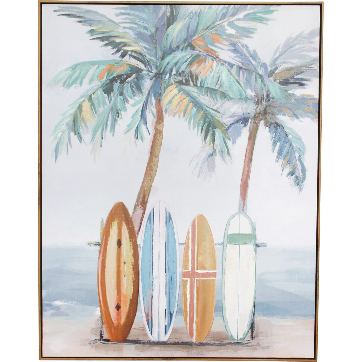 Framed Canvas Surf Days depicts a picturesque coastal scene, where skating boards rest against vibrant palm trees, creating a visually captivating and immersive experience. The carefully chosen colour palette showcases the mesmerizing hues of the skating boards, from ocean blue to bright orange. Perfect as an ornamental piece for any space or as a gift for a surf enthusiast, art lover, or beach lover in one's life, the Framed Canvas Surf Days promises to delight and captivate. With its generous size, Surf Days framed canvas becomes a focal point in any room. It can be hung in the living room, bedroom, or even the office to infuse one's space with a sense of adventure. Embrace the serenity of the ocean and invite the thrill of surfing into the home with the Framed Canvas Surf Days.
