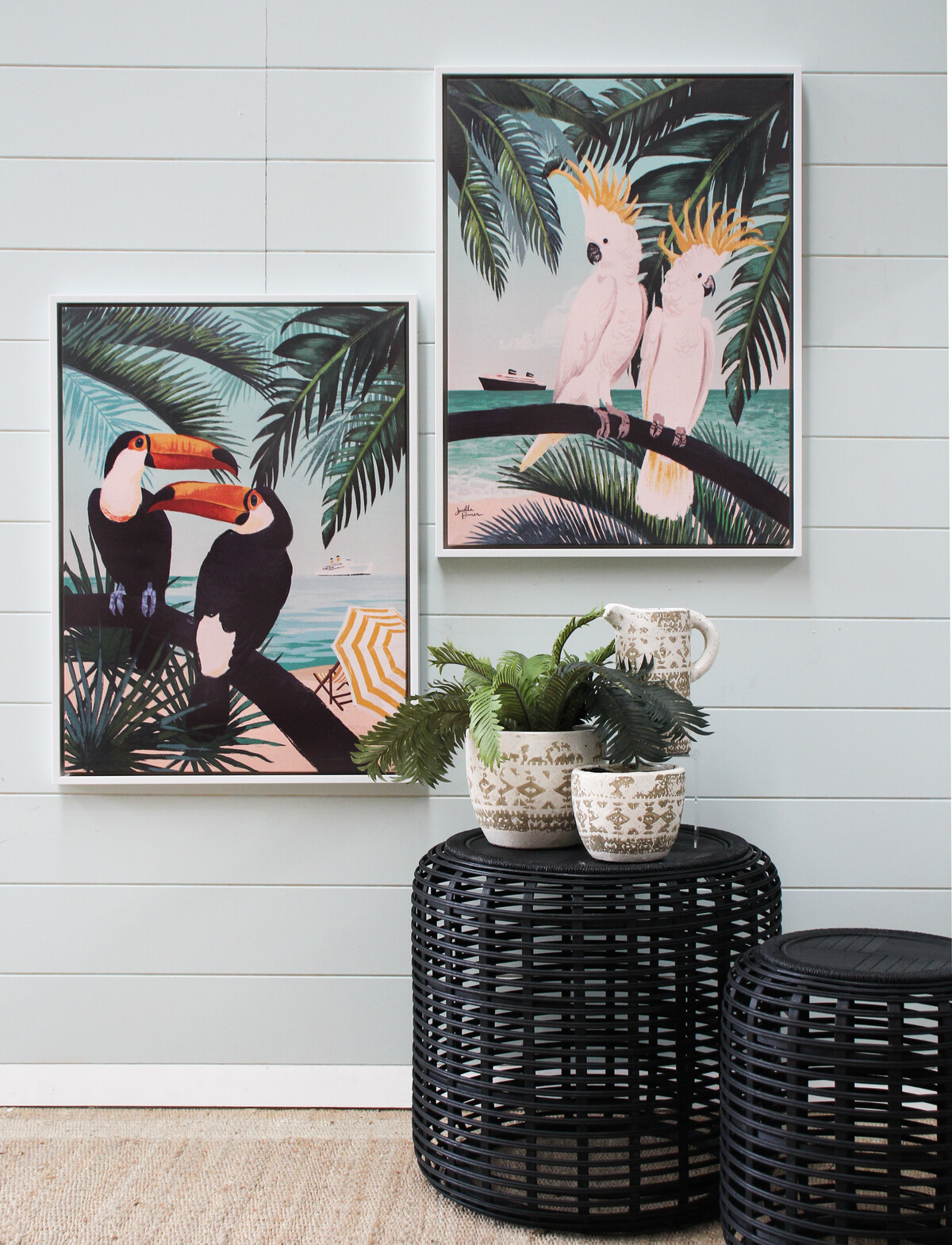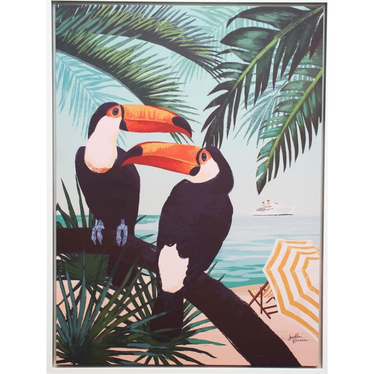 There are two variants to this collection of Framed Canvas Toucans artwork. The first artwork depicts a beach scenario in which a boat can be seen sailing in the background. Also visible in this beach themed setting are two umbrellas which obviously must belong to someone chilling at the beach. However, the focus of this artwork is not on the beach but on the two colourful Toucans lovebirds perched atop a tree. The second variant of this artwork also showcases a beach theme but in this case, the focus is on two beautiful Galah birds.