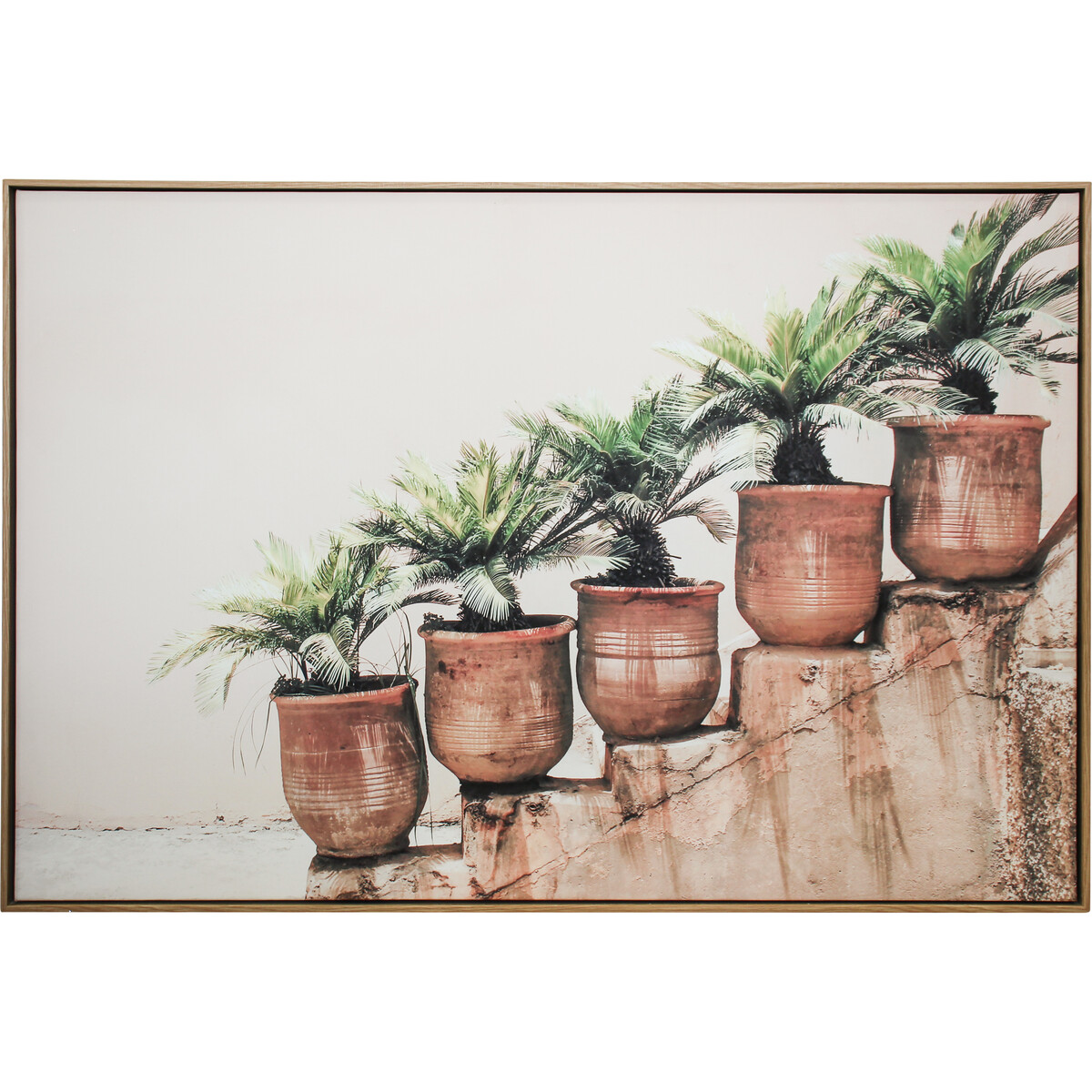 Framed Canvas Tuscan is awash with idyllic charm, and potted tropical plants inviting a sense of life and vitality into one's interior. This canvas art looks exotic with a mix of rich green tones, and the sweet smell of spring against a pastel background. Framed Canvas Tuscan illustrates new life and new beauty to all that is. Its gentle and warm colours will liven up a room one wishes to illuminate. Plus, it will transform any living room, bedroom, dining and office space into a captivating and inviting paradise. Needless to say, this softwood is void of blister, the fear of the canvas getting pierced by sharp blister is obliterated.
