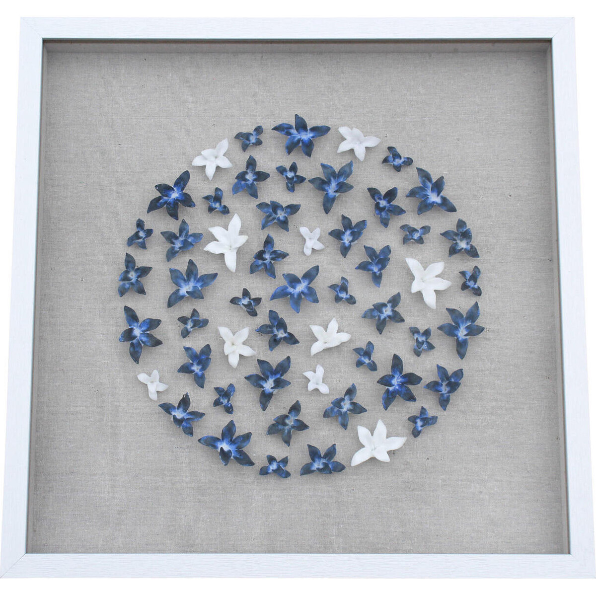 Bring a nature-inspired charm to any interior with this ceramic flower circle artwork that complements a variety of interior design themes. This one of a kind, handmade a piece of art has a polyresin frame resembling white painted wood in texture with a linen background that gives a nice soft and neutral look. The flower-inspired pieces that are grouped in a circle are crafted from ceramic and feature carved details and a two-tone finish. There are inserts on the back of these pieces to accommodate nails or screws making this wall decor ready for walls of any colour.