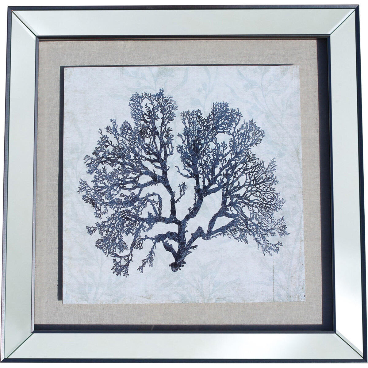 If your customers prefer beach style interiors, our framed Coral Blue 1 artwork brings the space to life with a shot of colour and hand-crafted layers that will warm the wall. If hung near a window, the mirror frame will catch the light by the window and the deep blue coral print (with hints of black and slightly darker blue) is reminiscent of the mysterious waters deep below. In an all-white bathroom with pale blue tiles and towels, this affordable art will speak of serenity and looks great with the textured light tan border around the print inside the frame. This graphic art print will also look great above the sofa in the living room or on the wall of a dining room.