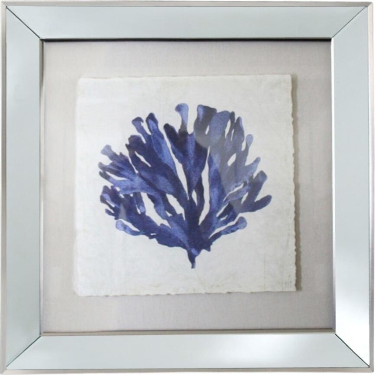 The wonder of water colours lies in its subtle hues and creation of form and depth with masterly use of shades. Here the simple usage of different shades of blue, and the stark contrast with the white background does the trick. Add this piece to your walls if you wish to build on the marine theme with more seriousness and see how the marine blue coloured artwork fits in like a glove. The framed art piece is square in shape and will be great for small and medium sized walls where it could be paired with pictures of other flora or fauna from the aqua world. Add it alongside more coral art-maybe along with coral sculptures for some company. The fan like shape of the coral gets vivid contrast from the white coloured frame and the width makes the picture seem very deep- and it is this creation of depth wherein lies its unique sort of beauty-as if the inky coloured coral is waving and swaying in the deep waters. A perfect ode to the beauty of the deep ocean. Being 50 cm in dimension, it could be placed on top of sofas or consoles and the fireplace-perhaps paired with other coral paintings.