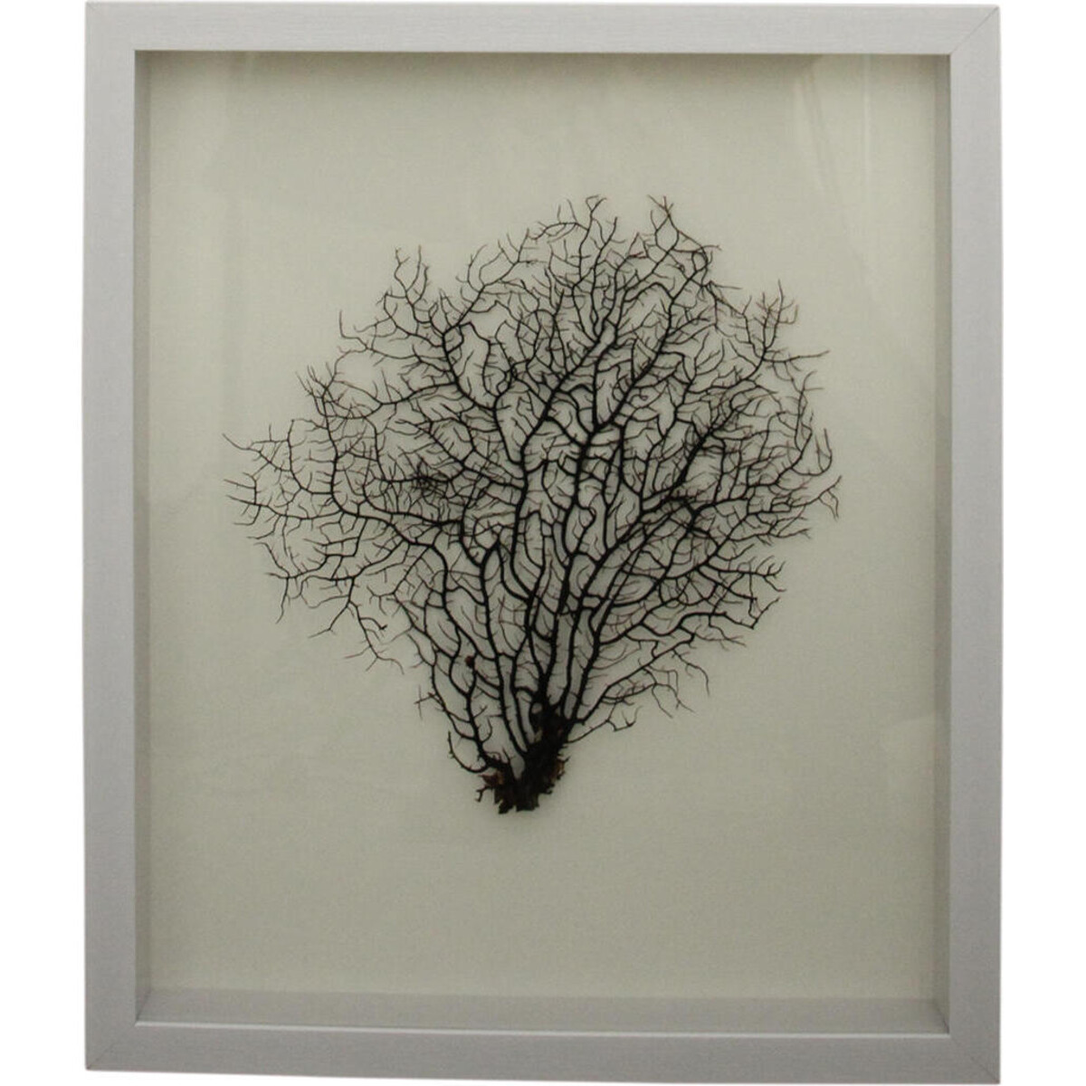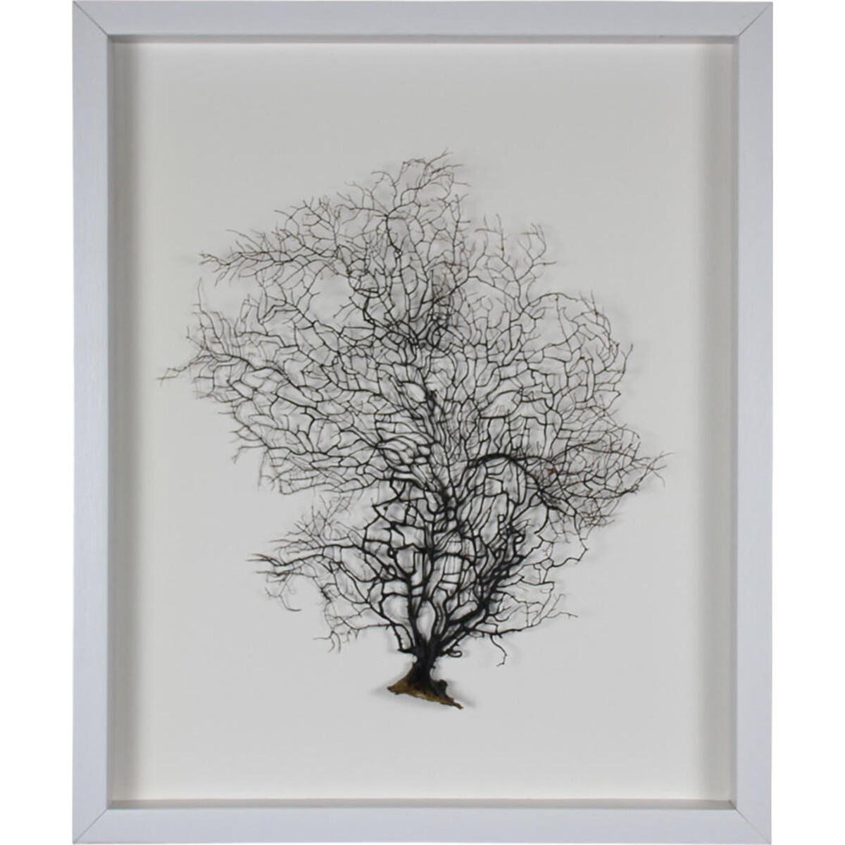 The framed artwork is one of a kind, much like the occurrence of corals that inhabit the marine world reflecting the wellbeing of those waters. This deep coloured, almost black coral has a shape like a terrestrial plant-a lot like a tree with a thick central trunk and incredible branching which makes it truly a beauty. It being framed in white and given a backdrop of white also adds to its stark and dramatic shape. A wonderful means to render your home more marine in theme. Add this along with the framed beauties and caret an impact most incredible for your home to enjoy-perhaps adding white sheer drapes or blue throws on the couch could add to the serenity of the look. The frame is 56 cm in height and 46 cm in width giving it the kind of resonant presence that this size of artefacts do manage to create.
