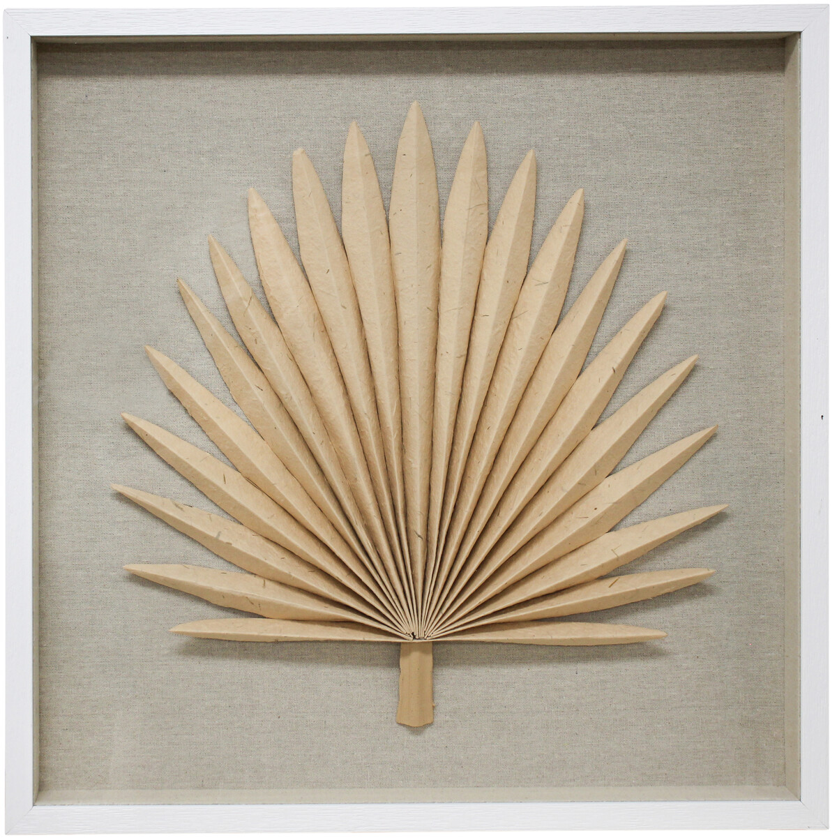 It's crafted from rice paper that imitates a dry palm leaf-folded and framed to give it a near natural look its minimal in its frill-high on dramatic impact owing to its starkness and simplicity and usage of minimal colours- and has oodles of character. will look stunning on any wall drawing attention as it does to its simple shape, great usage of varied material and the usual impact any kind of three dimensional art usually brings with itself. the simple white frame, the linen material that adds its own natural charm and the starkness of the folded leaf adds to its unique kind of look. the soft hues are minimal in colour impact thus drawing attention to the form more dramatically. its neutral theme allows usage in all kind of spaces and styles of decor.