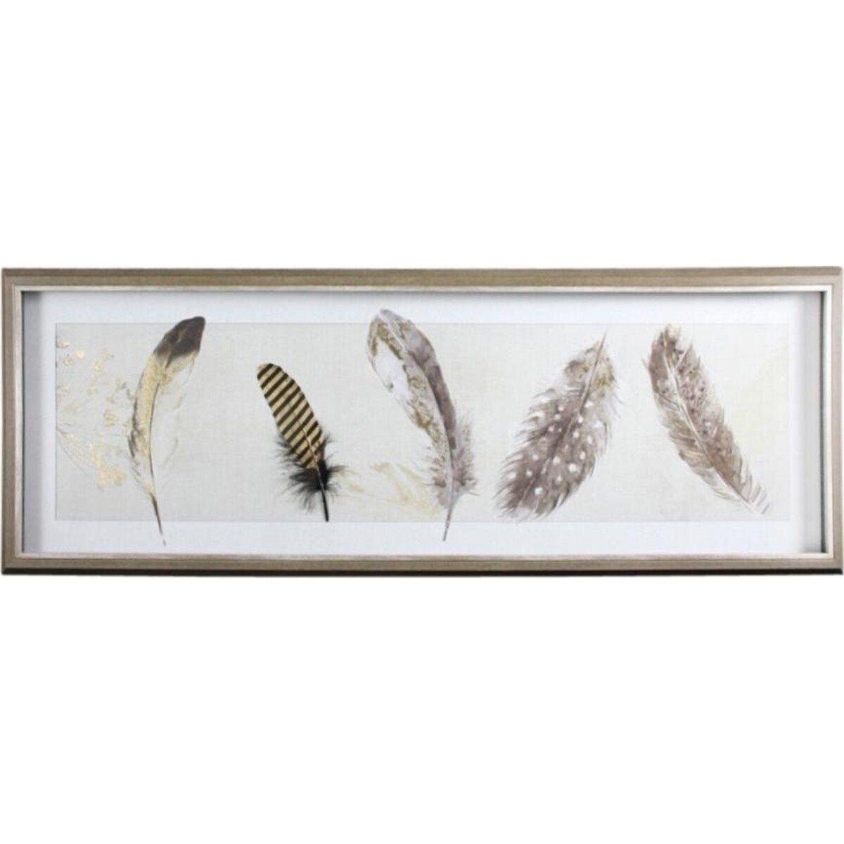 Begin a conversation round its different colours and shapes-try guessing which bird it could belong to-there are several such impressionist pieces of art we host for you that will begin many a conversation in your home and spaces. Add the feeling of lightness and the subtle beauty of shades and hues that theses feathers come in. This print on canvas brings out the details on each of them with much perfection. The vivid colours, the subtle play of light and darker shades and the details-all clearly visible makes it a great addition for the living room or the bedroom where you might want to add more elegance and charm. Nature inspired art work has the ability to gift your spaces this form of beauty-a beauty that even in its minimalist kind of state is awe-inspiring. The canvas print is framed in light beige coloured wood look MDF. The off white coloured backing paper contrasting subtly with it. Will look resplendent in any kind of setting , be it modern or traditional. The rectangular framed art is 90 cm in width and 30 cm in height.