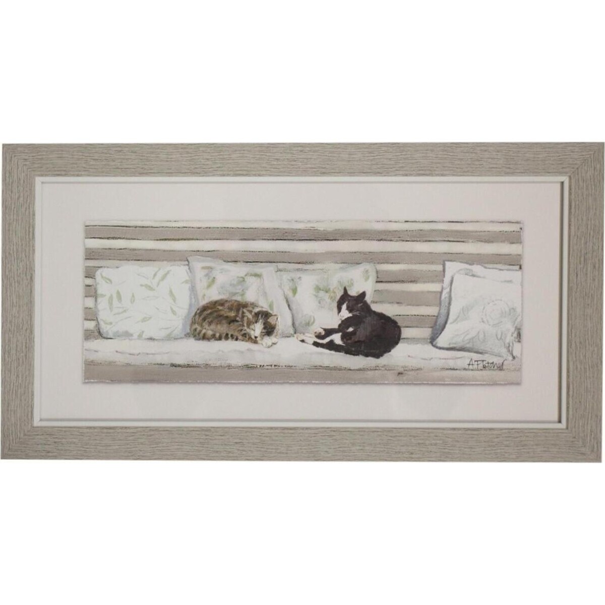 This ready to hang art piece featuring two kittens one brown and one black sleeping in a dreamlike manifestation is a high - quality print of expressionism at its finest and will compliment any decor whether it's displayed in the bedroom, living room, kitchen or office and is perfect for a vet clinic. Afternoon naps will never be the same again with this lovely illustrated pair and you will feel like cuddling up with them too! This muted, subtle painting serves as an excellent counterpoint, especially if one hangs it in close proximity of brilliant, more vivid colours or brightly coloured wall space and can make a nice gift for cat lovers of any age.