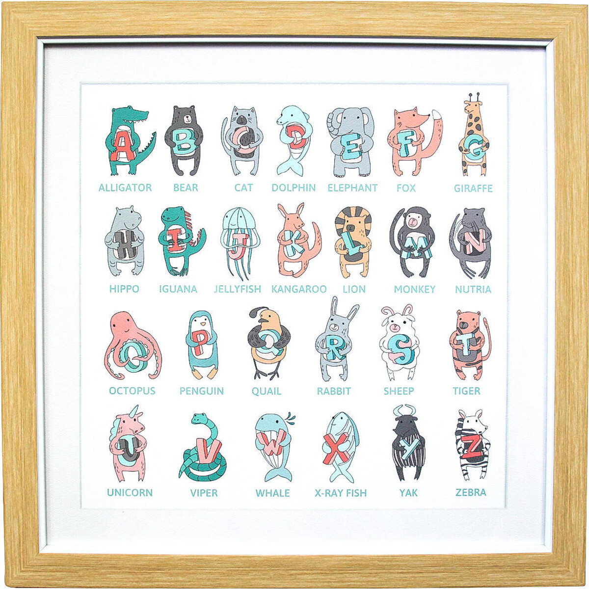 Place this in the kids' room or delight your little nook where you settle down with your favourite cuppa and bring back your childhood memories - after all, the quirkiness of setting your home as per your idea gives vent to a more imaginative use of such art. Printed on paper this piece is a delight - filled with the undeniable charm that simple things possess. The white backdrop brings into prominence each tiny letter and its graphical be it the rabbit, the zebra or the sheep - each one holds his own letter with utter seriousness and gives this square 40 cm dimension framed print a wonderful cheery appearance. Whether you learnt your alphabet back in school or not - adding it to your walls will bring a touch of cheer and a whimsical take at how décor should look.