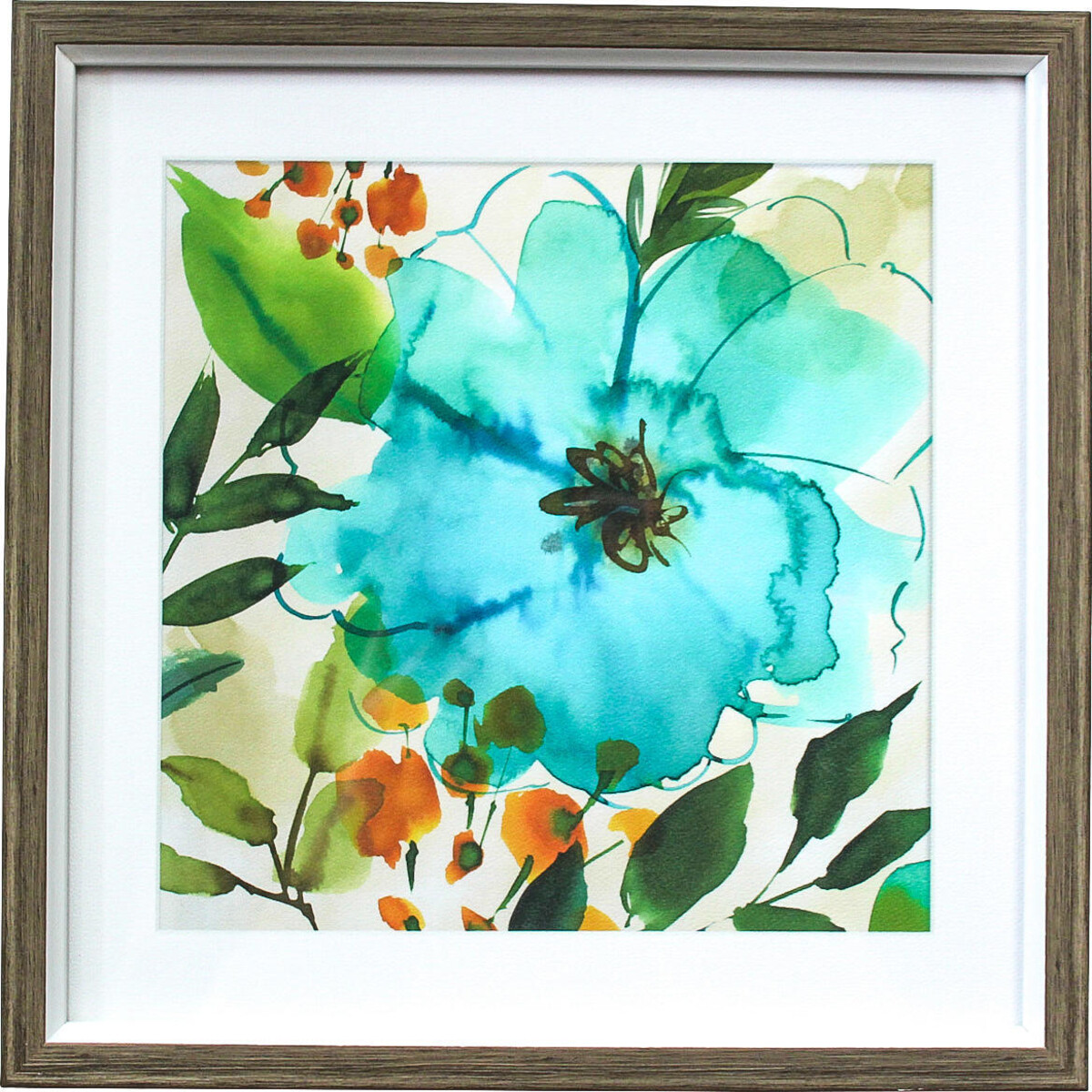 The aqua blue is such a pleasing colour to add to your walls - and when it comes in floral form, it becomes all the more pleasing. The square art work is framed in brown adding to the perfect finish to its look. The white background adds to its delicate form and very pleasing looks, the splash of natural colours like green, blues and ochre adds to the distinct look. You could combine this with other nature based art work that adds a certain kind of gorgeousness that your saces need to look fresh and inviting. Artwork always bring with them this distinct kind of look that is most attractive. Be it behind the console, the sideboard or the couch, this kind of artwork adds that soft mellow feel to any space adding instantly that charm and grace that such art always bring with them. The wood look frame.