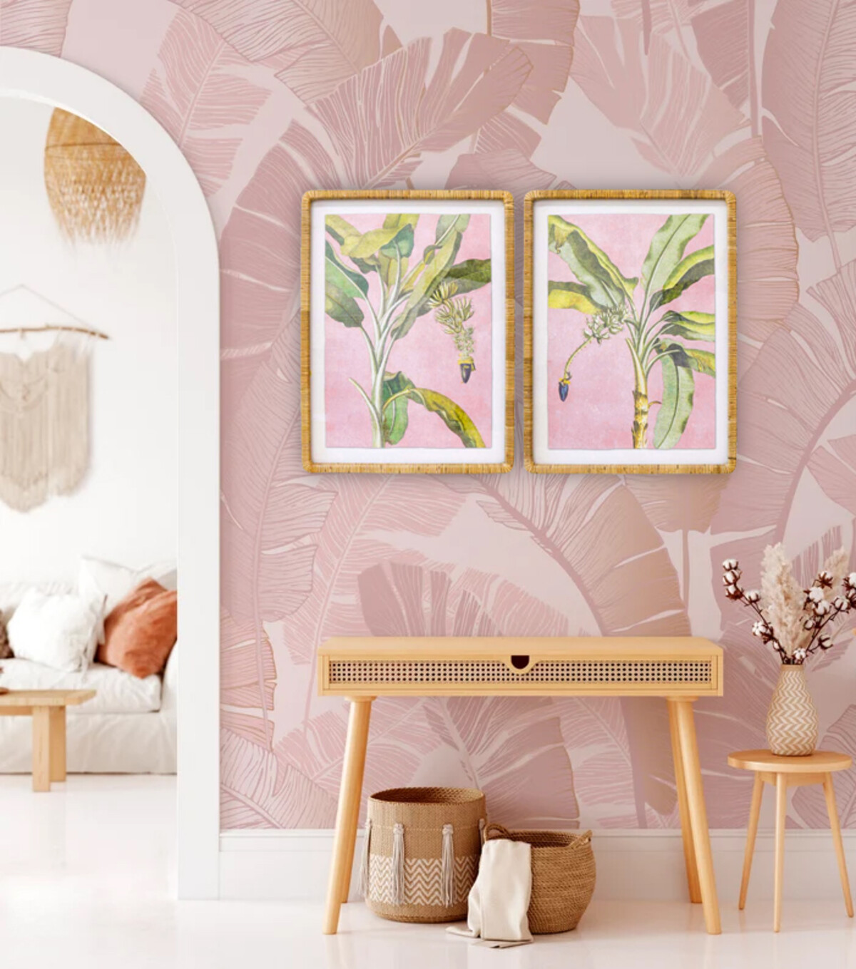 Each piece is generously sized at 60 x 80cm. So they’ve got real presence without swallowing up the wall. The thing that stands out for us, though, is the soft vintage pink backdrop and detailed banana palm illustration. It’s not loud or garish - just a pop of colour and vintage inspiration for interiors that want warmth and texture but with subtlety.