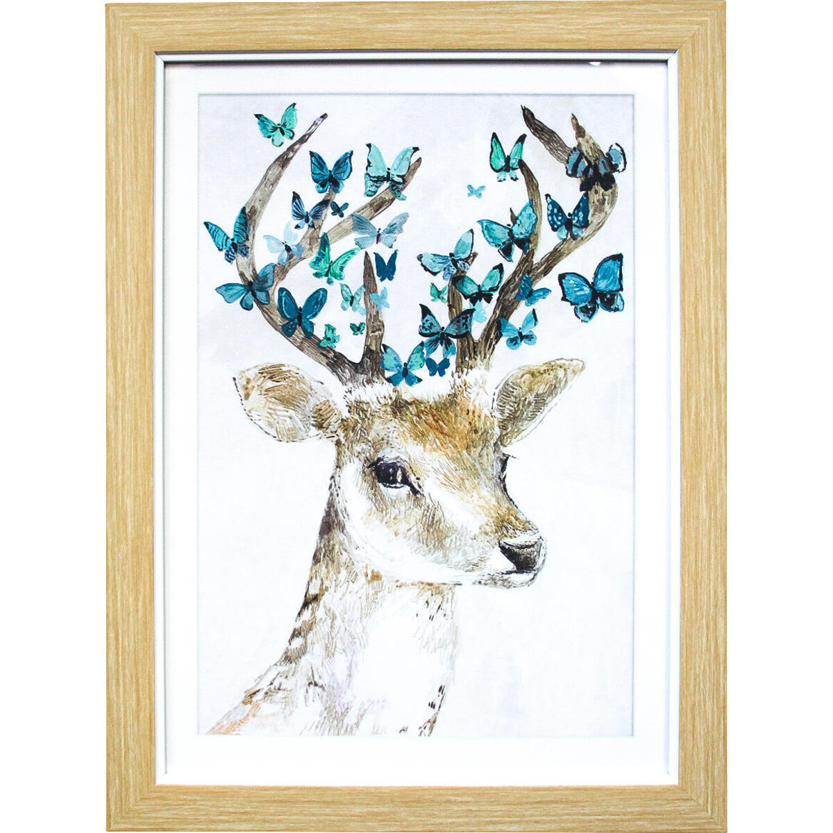 Give your walls the much - needed seasonal freshness with this spring and summer ready print featuring the most endearing of stags with a crown of butterflies on its antlers. Printed on paper, the artwork brings alive the beauty of nature in the softest of colours the artistry lying as much in the original water colour as with the fine kind of printing that brings alive each of its detail. As they say it is the imaginative rendering of an idea wherein lies art - here is just another such example of how the beauty of nature has been well depicted using the simplest of symbols of beauty. The profile of the stag - the bright coloured butterflies and the entire composition of this piece gets further highlighted by the frame in light wood colour that defines the picture so perfectly. Add this to any space and invite a fresh new appeal.