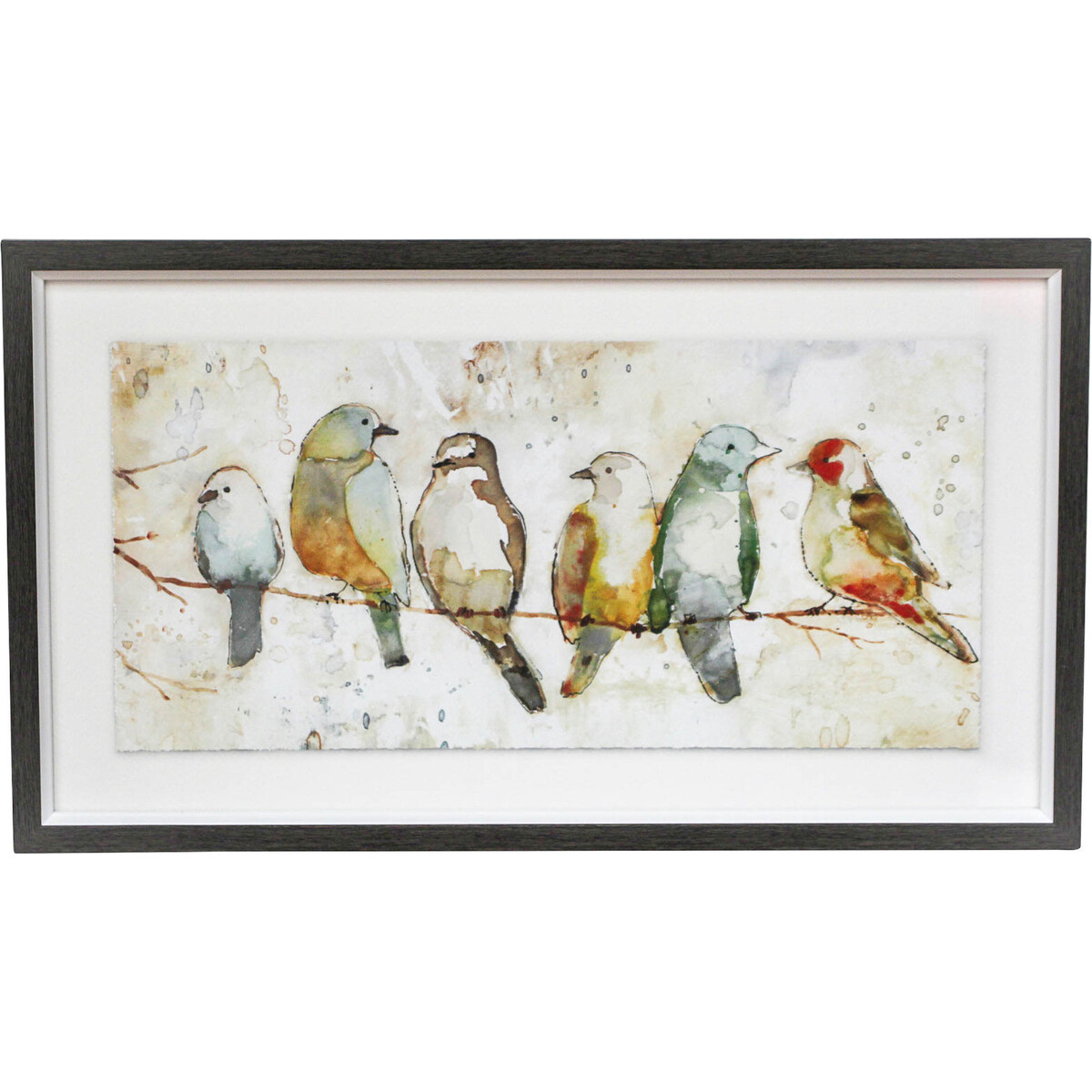 The Framed Print Bird Chatter is a nature themed artwork that showcases a flock of six colourful birds seemingly engaged in chatter. All six of the birds are perched on a single tree branch and are arrayed in a wide variety of colourful feathers including green, red, yellow, brown and many more. This painting is framed using MDF and encased in top-quality glass.