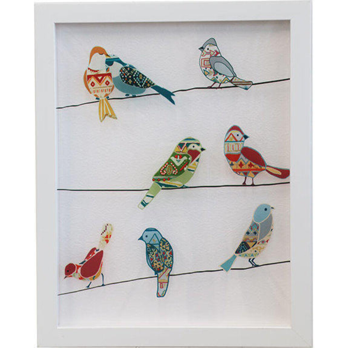 Some art need not be serious - it could simply be a unique depiction of colours, shapes and forms that connects with you, and this modern rendition does just that. The parchment print has birds sitting on a line that that criss cross over each other giving one the feeling of a certain dimensionality to their presence. The colourful birds are caricatures of the real ones and yet filled with a vibrancy as if waiting to take flight. Captured within the MDF frame, which seem like a tiny window to this work of wonder, the birds look superbly at peace. A spring fresh look can be built into any space that needs a touch of colour and style. Very modern and chic, this artwork can make a difference to the manner in which your nature based theme could look. The height of the art work is 44 cm while its width is 34 cm making it most appropriate as space filler on small to medium wall spaces - maybe behind the sideboard, the console or above tables and shelves.