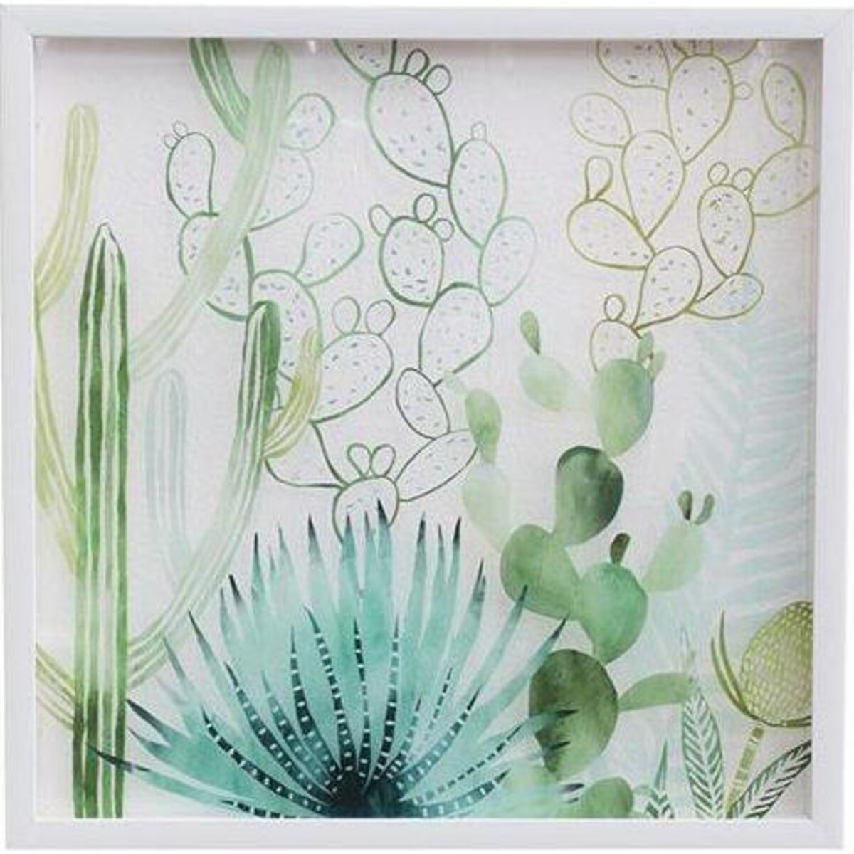 A cool yet vibrant composed print makes this a lovely find from Lavida. A collection of a variety of plants seem to make this green print an outstanding feature on the wall if you are looking to find a summery, cool coloured art work. The print is fine, the colour resolution dense and impactful and the finish given to the framed picture really great for all kinds of spaces. It is about 50 cm in height and width with a raised white frame made of MDF and is covered in glass which gives the image a certain kind of dimensionality. Place it alongside other art work related to nature and better still team it up with white framed ones to maintain cohesiveness. You may sue corals or other plants in coordination with this one. The cacti in various forms merge into one another, some dense and some very lightly printed to give this artwork a truly eclectic appeal.