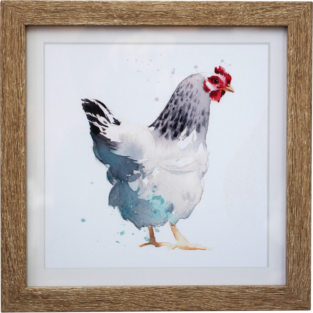 This livestock inspired art features organic colours and adorable animal picturesque custom-made for clients who desire a natural ambience. The beauty of this work of the heart is its uses of vivid and brilliant colours that will complement the client's choice of furniture. Chicken spirit animal adds some farmhouse flair to one's interior. Framed Print Chicken is painted on paper and MDF (Medium-density fiberboard). MDF is a worthy alternative owning to its vantage physical and mechanical properties. The MDF board features a smooth surface lacking natural defects, twists, or knots. This MDF artwork could bring one good luck and radiate positive energy, provoke prosperity, and never wanting for everyday needs. Fix this artwork above the mantelpiece or create an accent wall in hallways with this artwork