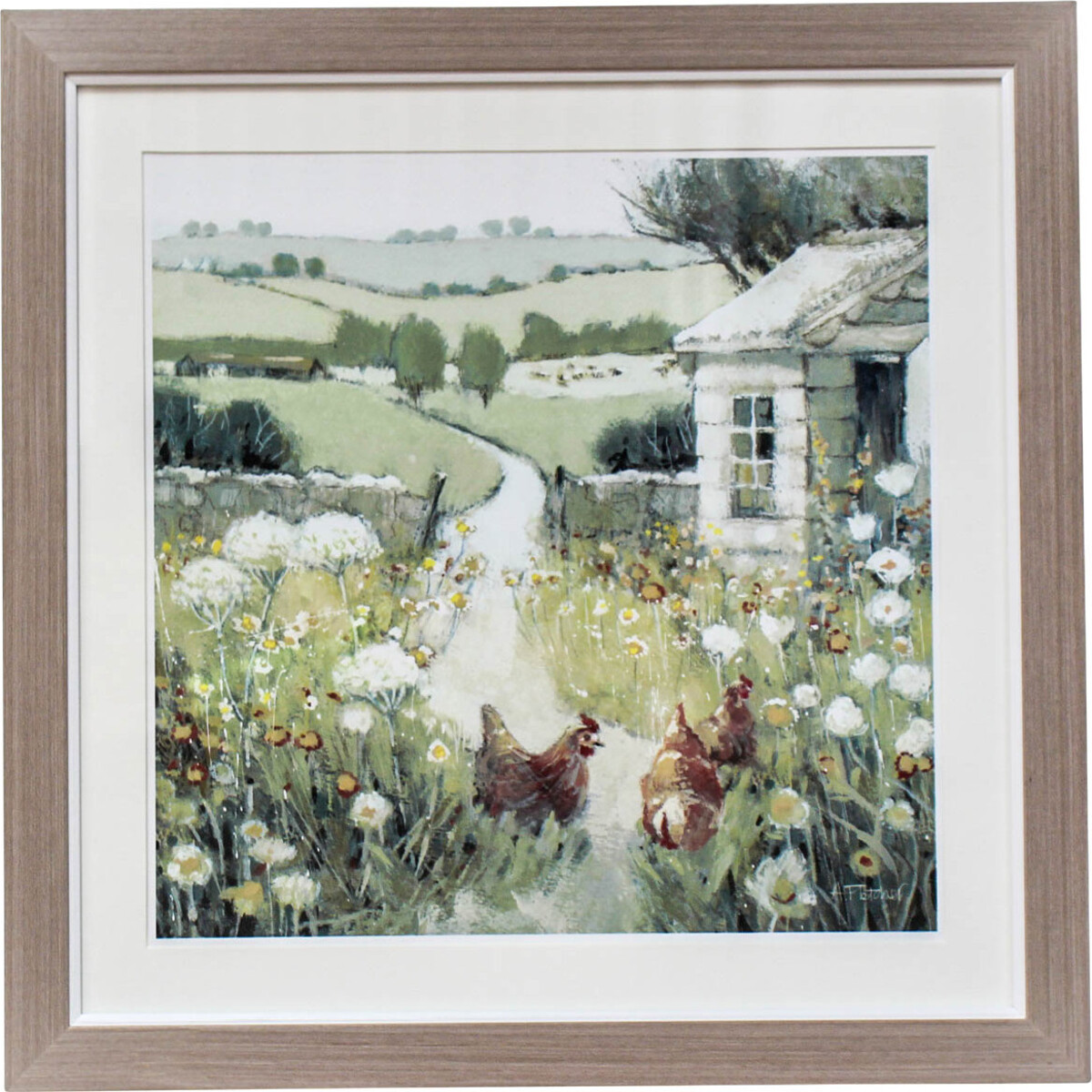 Contained in a square 42cm by 42cm Medium-Density Fibreboard frame is the Framed Print Country Life2. This art print showcases a country range with uneven landscape, trees, farm houses, cattle ranch, and three hen birds standing in the midst of vibrantly coloured bloomed flowers. The setting is that of a settlement of several farm houses in their rustic beauty and attractiveness.