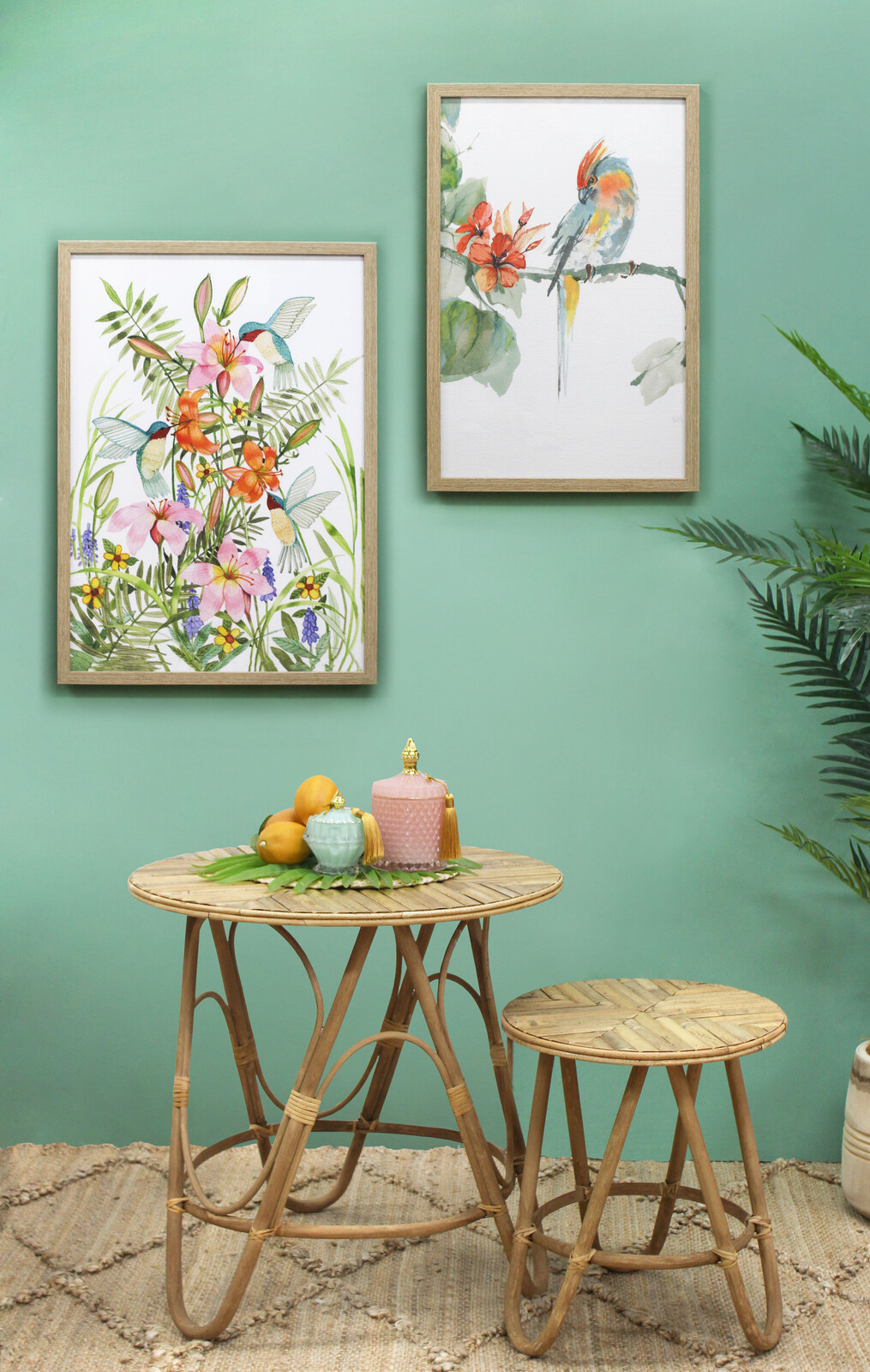 The parrot sits quite elegantly on the branch with these gentle floral notes around it. There’s something quite calming about the overall effect. It measures 40x60cm and features premium glass, resin, paper, and MDF. A beautifully finished frame in natural wood tones is part of it too.