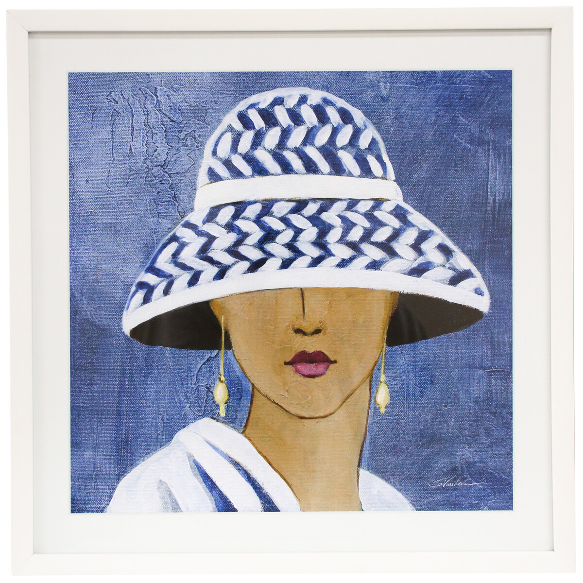 The irresistible elegant visual attraction which this Framed Print Elegance creates is a product of the artful combination of different material components, the thoughtful choice of palette and the unconventionality of the fashion sense of the depicted lady which lends the artwork the tremendous visual statement. Printed on top quality paper material is a lavishly lacquered navy blue decorative backdrop over which is painted the image of a lady who wears a wide brimmed hat. This hat lends the overall depiction an aesthetic statement as the hat in itself, makes a grand decorative statement.