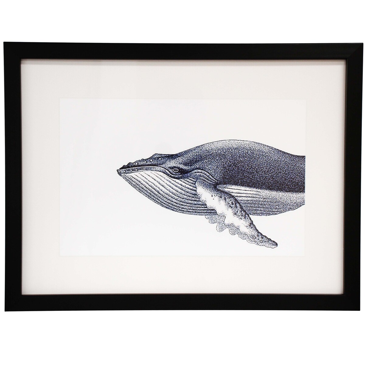 Featuring a pristine white paper background upon which is depicted in various shades of blue and grey, the image of a blue whale which is depicted in a half portrait mode. In realistic imitation of the real blue whale, it showcases the large mammoth which remains to this day, the largest animal known to have ever lived on planet earth. It is encased in premium quality resin and crystal clear glass. It is then framed using black painted medium density fibreboard material. It measures 30 centimetres in length and 40 centimetres in height.