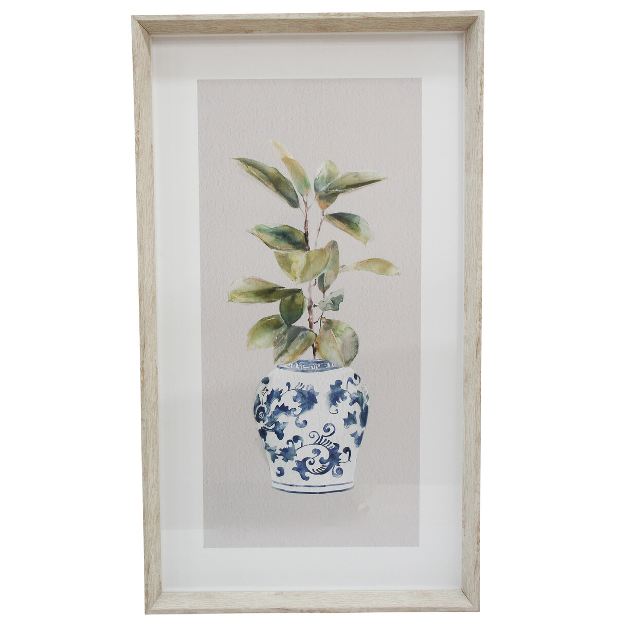 We love that our Framed Print Ming 2 is a bit different - it’s one of those pieces that always stands out when people see it. The hand-finished paint and gel make each print totally unique, so you’re never going to get two exactly the same. And that’s got to appeal to customers - we’ve found there’s something special about knowing you own a genuine one-off, especially with decorative wall art like this. The colours are quite subtle - it looks almost as though someone’s brushed them on with watercolours, which pairs well with the blue and white resin vase artwork. These tones work brilliantly with white or cream walls (in home or office settings), but we’ve seen some of our buyers put this in darker spaces for contrast and, honestly, they look fantastic. It’s 40 x 70 cm, and because it’s glass, resin, paper and MDF it feels solid and definitely not mass-made.