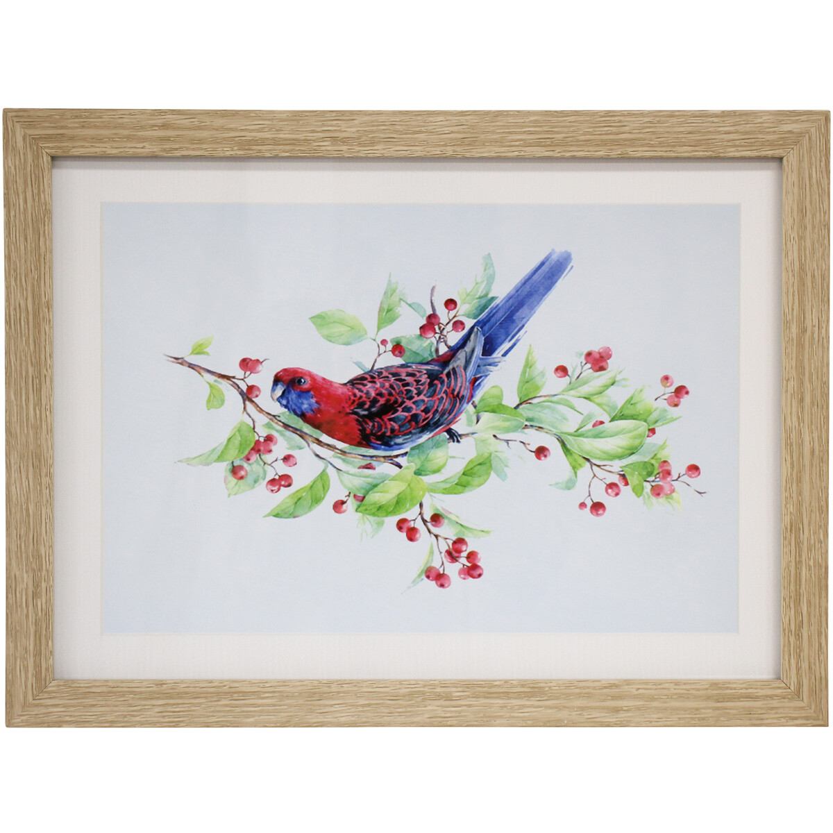 Showcasing a premium quality rectangular shaped paper which has its surface printed with a bright Pearl River shade of grey with the artful painting of a rosella parrot in bright colours, the Framed Print Rosella would make a bold visual statement wherever your customers may choose to display it. The crimson red and blue plumed Crimson Rosella Parrot is depicted as feeding on red berries over a tree branch with green leaves and numerous red berries. The entire paper print is then encased using resin enclosed in glass and then framed using medium density fibreboard material.