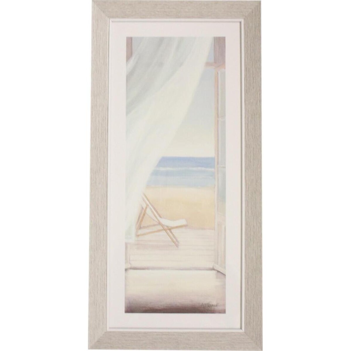 Bring the beauty of nature into your home with this stunning framed illustration with the cool breeze blowing away the lovely white curtain that gives a glimpse of the beach chair, the pristine coast and the sea. The drawing captures the blissful serenity and tranquillity of the tide and water dappled sand perfectly. Though this canvas will look wonderful wherever you hang it, the soft pastel, white and grey colours will nicely match the bedroom and the beautiful calming scene will be helpful in inducing peaceful sleep. Such a tranquil picture is also great to decorate the wall of the sun lounge or gift to someone as a retirement present.