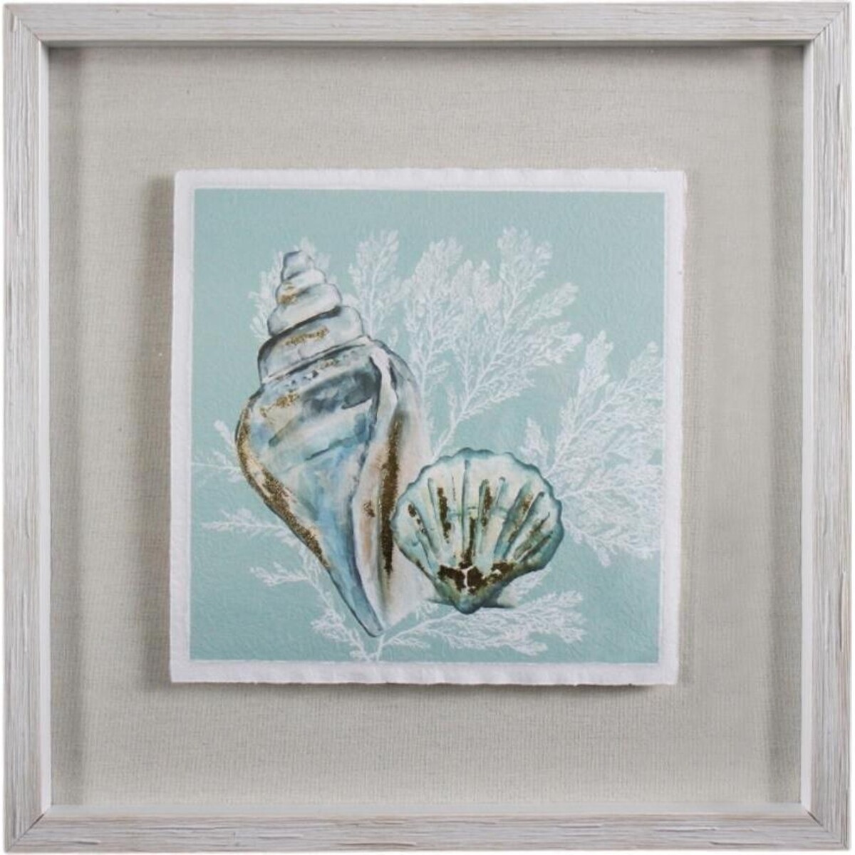 Your coastal themed home could look all the more stunning if you showcase just the right kinds of symbols from this water hemisphere in your home-like shells and their stunning beauty. They are homes for some creatures and we can spot them aplenty on the shores. This art work plays a tribute to its beauty in a subtle play of water colours. The oyster shell and its scalloped shape with the conch by its side- and the fanning out of some weed or coral as the backdrop is the focal point. The framed art work has a subtle white shaded frame in rustic feel, the art work is a lightly raised to give it a more focused feel. The square shape with 40 cm dimensions makes it easy to be used along with other artwork of the same nature thus helping in creation of a cluster of such pieces on the wall for greater impact. Give your home the allure of the coast and give your aquatic look space something more than ordinary.