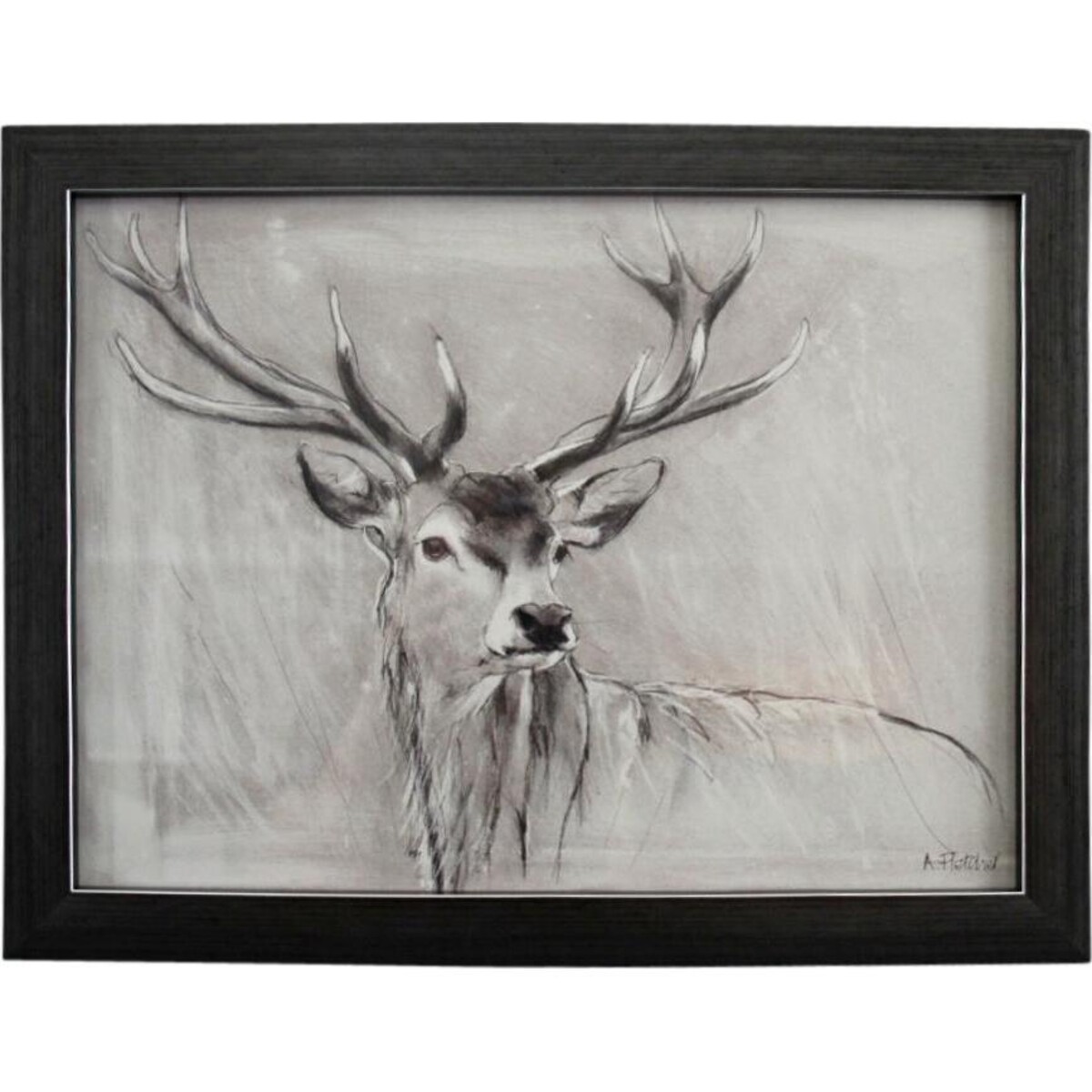 The head seems to be turned to catch a sound -maybe a twig breaking under padded feet-or the scent of a predator that it seem to have caught-this rather animated stance of the stag makes this such an interesting artwork to have on the wall adding as it does a sense of excitement, anticipation and of course a great deal of rusticity that any country and farm feel home would love to have .