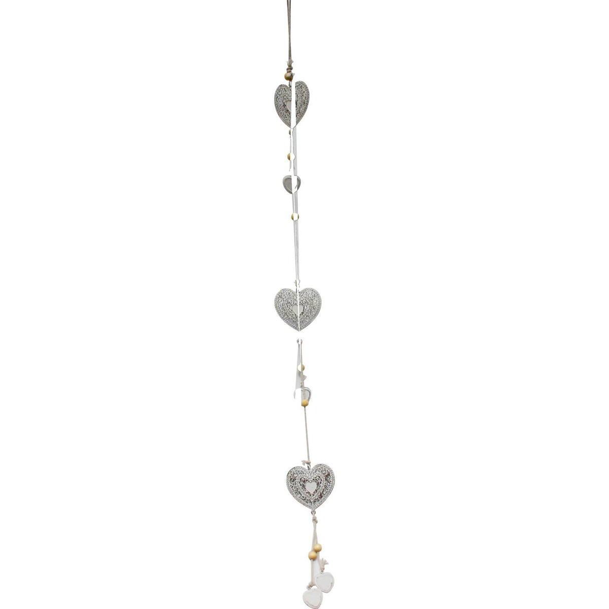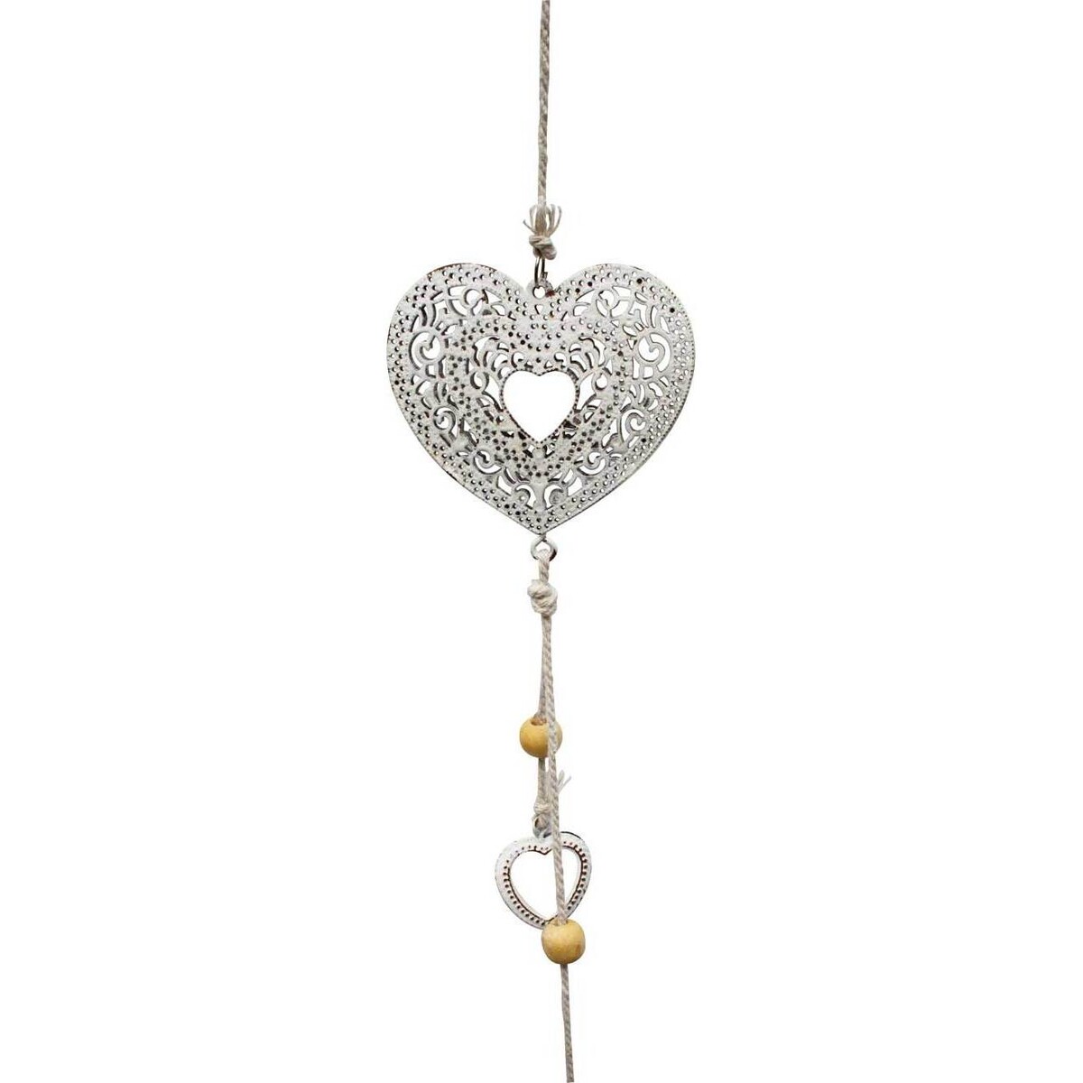 The elaborate metal cutouts in the hearts of the Garland Heart Ball from LaVida are reminiscent of delicate lace doilies. Each of the three metal hearts along the length of a 90 - centimetre white rope are punched through for an airy, lacey appearance. Along with these metal hearts are smaller metal hearts interspersed along the garland with tiny wooden balls for more visual interest. The metal is finished with a white, distressed paint with worn areas where the metal underneath shows through. The garland is finished with more tiny hearts tied at the bottom and a simple rope loop at the top for hanging.