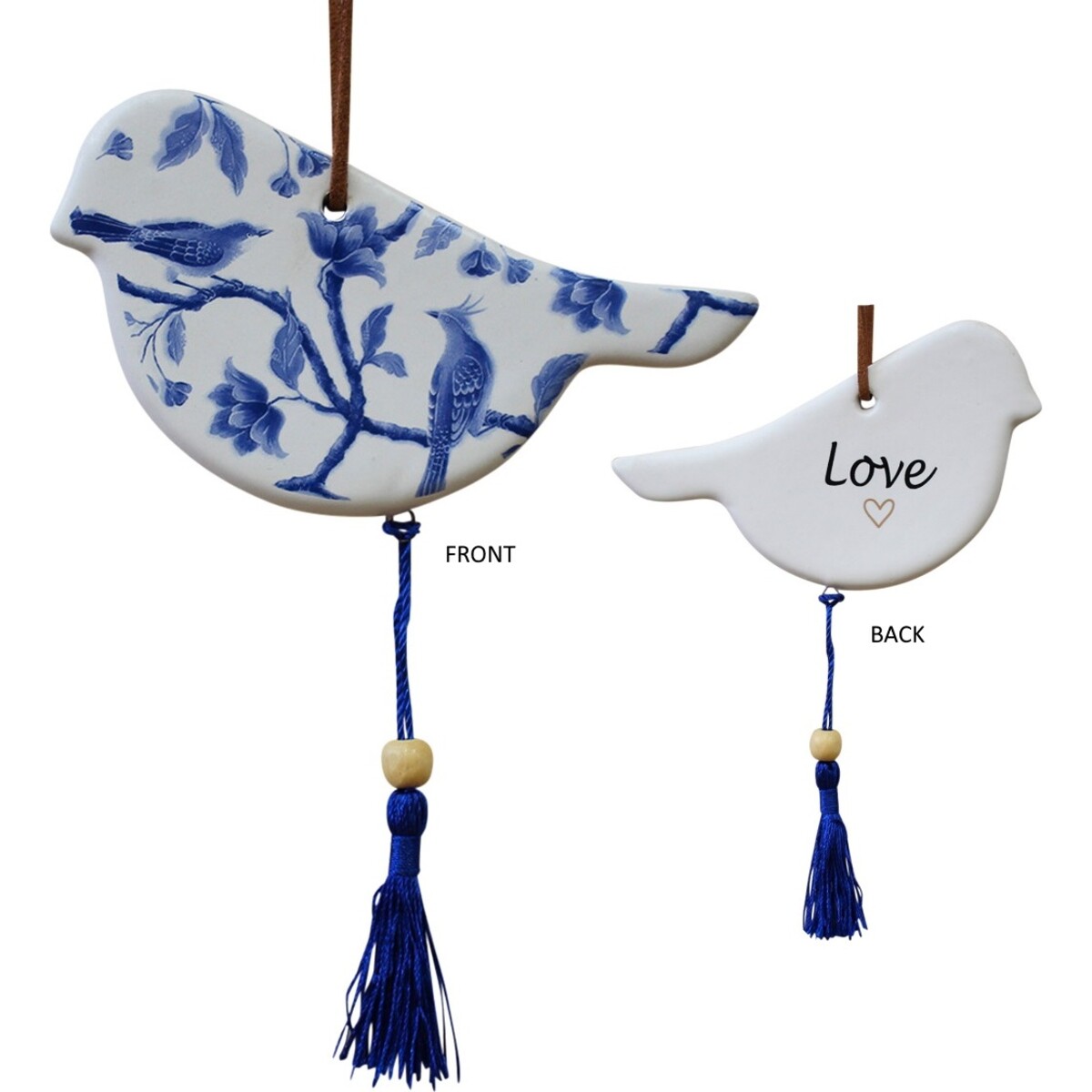 This little bird simply twirls and spins on the thread hanger that it comes with. Made from fine quality ceramic, the creamy white of the base contrast splendidly with the blue of the vintage pattern that is also made up of little birds -it adorns one of the faces of the birds and on the obverse side you have the word printed in black which says simply-LOVE- and who would not feel that emotion on seeing this pretty little creature. Inspired by nature and sure to bring much joy because of its timid little presence that is finished so well with this tassel that is coordinating so well with the blue and white combination of the ceramic bird. The bead adds a touch of beauty too. Dress up windows, or knobs or simple drape it across lamps or hang it as a tassel from your satchel. It is all of 12 cm in length and about 8 cm in width, and does help in removing the monotony of spaces.