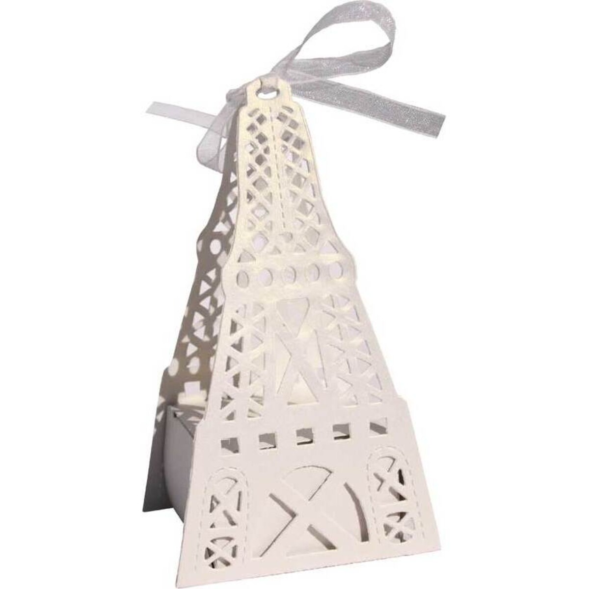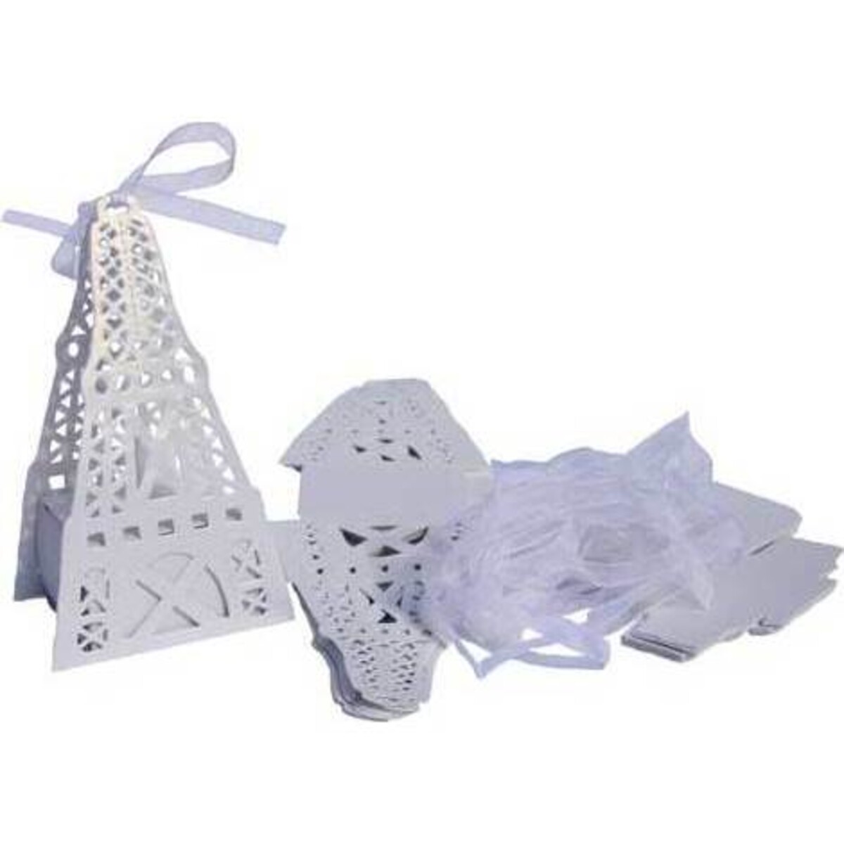 Add the charm of Paris to your gift with this Eiffel tower look card board box that can play host to a small little gift you may have planned to give away. The Eiffel tower is a 13 cm tall structure made entirely from sturdy cardboard-all white and nestled at its base is the box with 6 cm dimensions that could hold your precious little gift. Add the magic of Paris to your gift or use it in bulk to give away a part favour. The tiny little gifting box is truly unique setting your gift apart from the rest. The top of the tower could be easily closed with the help of a ribbon that loops across the top of the Eiffel structure. Innovative, dainty and very charming in its Parisienne flavor. The cardboard box at its base is built and reinforced well so as to not give away despite having a fairly heavy gift within.