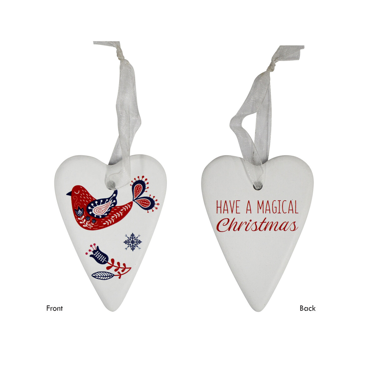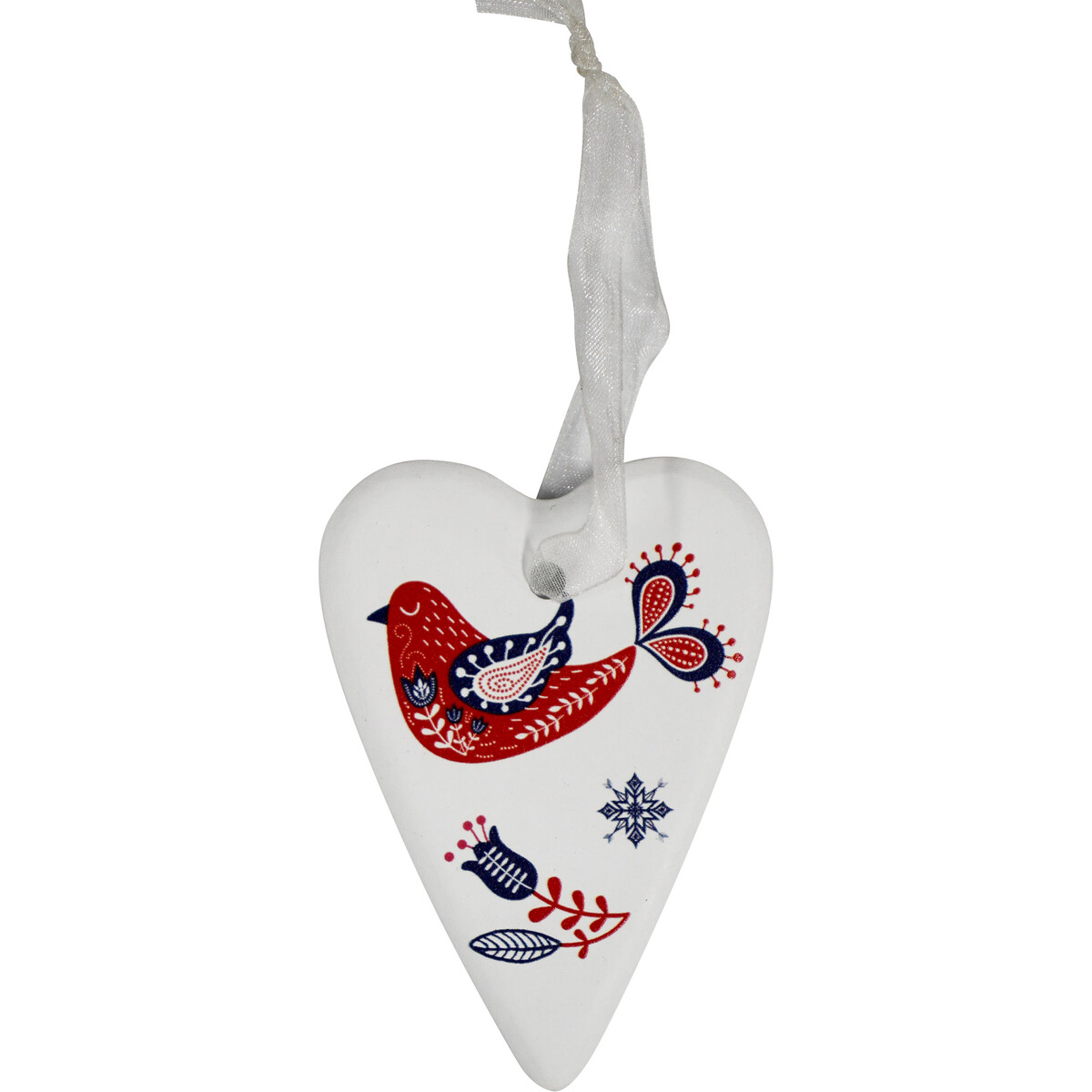 Gift Heart Folk Christmas - 6x8cm + Hanger We love the little details of the festive season. It’s the small touches that make a difference, like our Gift Heart Folk Christmas ornament. At 6x8cm (plus the hanger), it’s beautifully proportioned for customers looking to fill in gaps on their tree or add a special touch to gift wrap. That’s something we get asked for a fair bit, by the way - unique pieces that won’t get lost between the bigger baubles and tinsel. But what really stands out? We think it's the folk-art inspired bird motif - all those rich reds and indigos sitting against the soft matte ceramic. And it’s not mass-produced either - each one is handcrafted, so imperfections in the ceramic and print just add more charm. They’re a bit rustic, honestly, but we feel it adds authenticity. There’s a smooth leather hanger too, which gives them a bit more polish if you want to hang them outside of Christmas - maybe on a shelf or even a hook at your desk for something cheerful? However you use them, they’re going to look and feel unique - part of that homespun feel people really gravitate toward now.