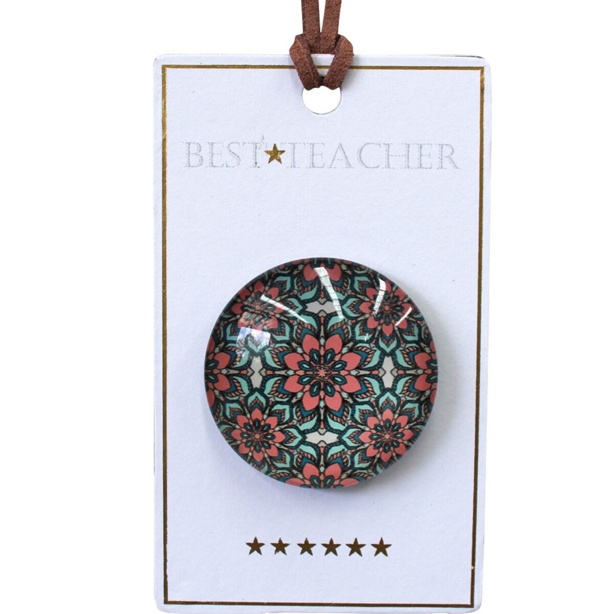 The Gift Magnet Best Teacher Moroc is a decorative magnet that can be used to liven up the décor of a home, car, office, personal items such as phones and laptops, etc. It has such a strong magnetic force such that it would stick to whatever metallic surface it is put. And if the user doesn't want to use the magnetic function, s/he has the option of hanging it via the quality leather strap that comes with each one. The mandala design features petals of flowers jointed in layers of circles which continues to decrease in diameter as the circles get to the centre. The flower petals are coloured in a variety of creamy pink, white, jade etc. which is topped by a glossy, shiny, glassy surface. It is made of premium quality metal, glass, magnet and leather.
