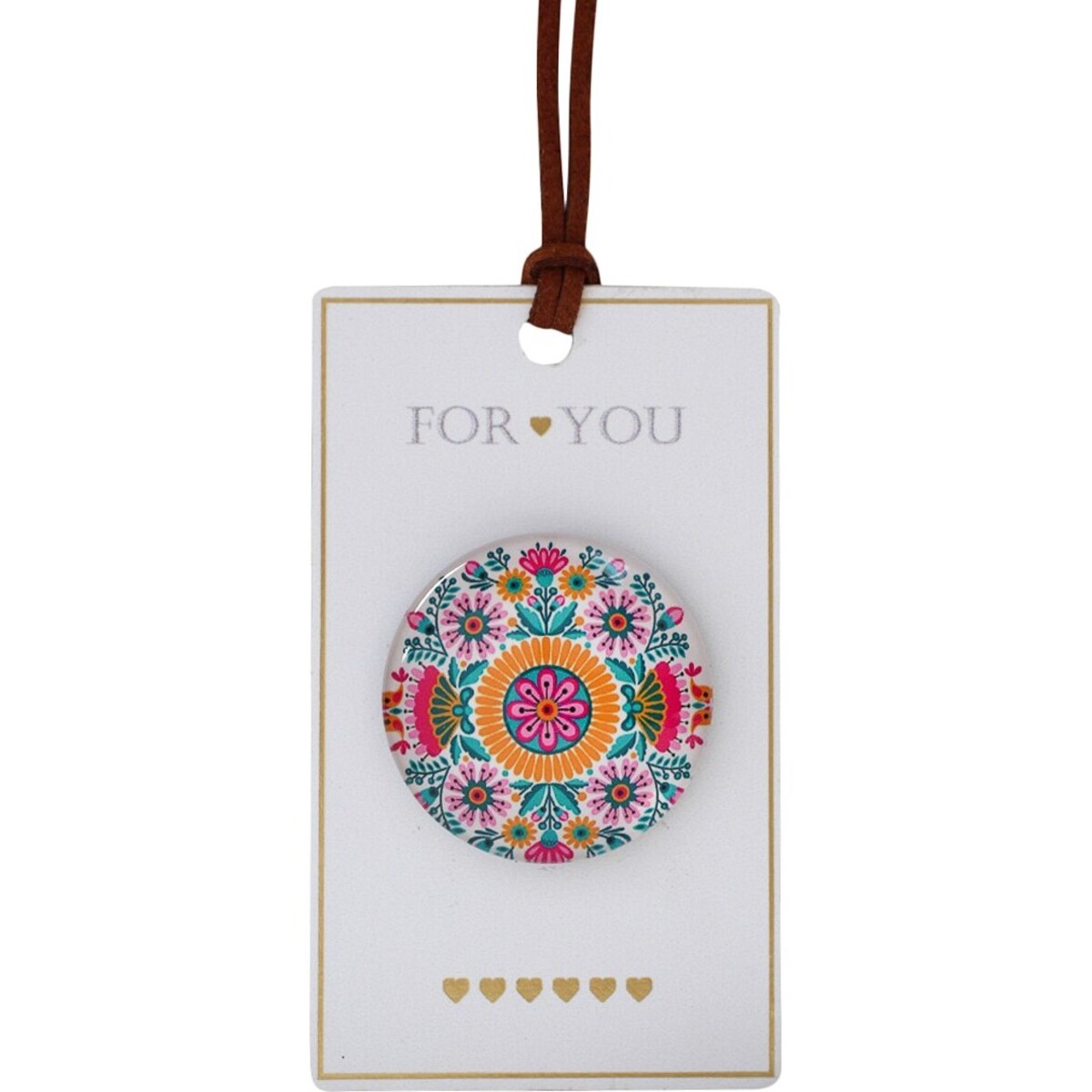 This glass magnet reads 'For you.' This is a subtle approach to communicates love and happiness. It comes with a ribbon and hand-painted graphics that have a gloss finish. This conversation starter will not fail to impress guests. Attached to the magnet is a leather rope that feels smooth on one's skin. Its leather rope gets better with age. This masterpiece is not restricted to metal home appliances. It is a gorgeous accent for workspace for metal office cabinets.