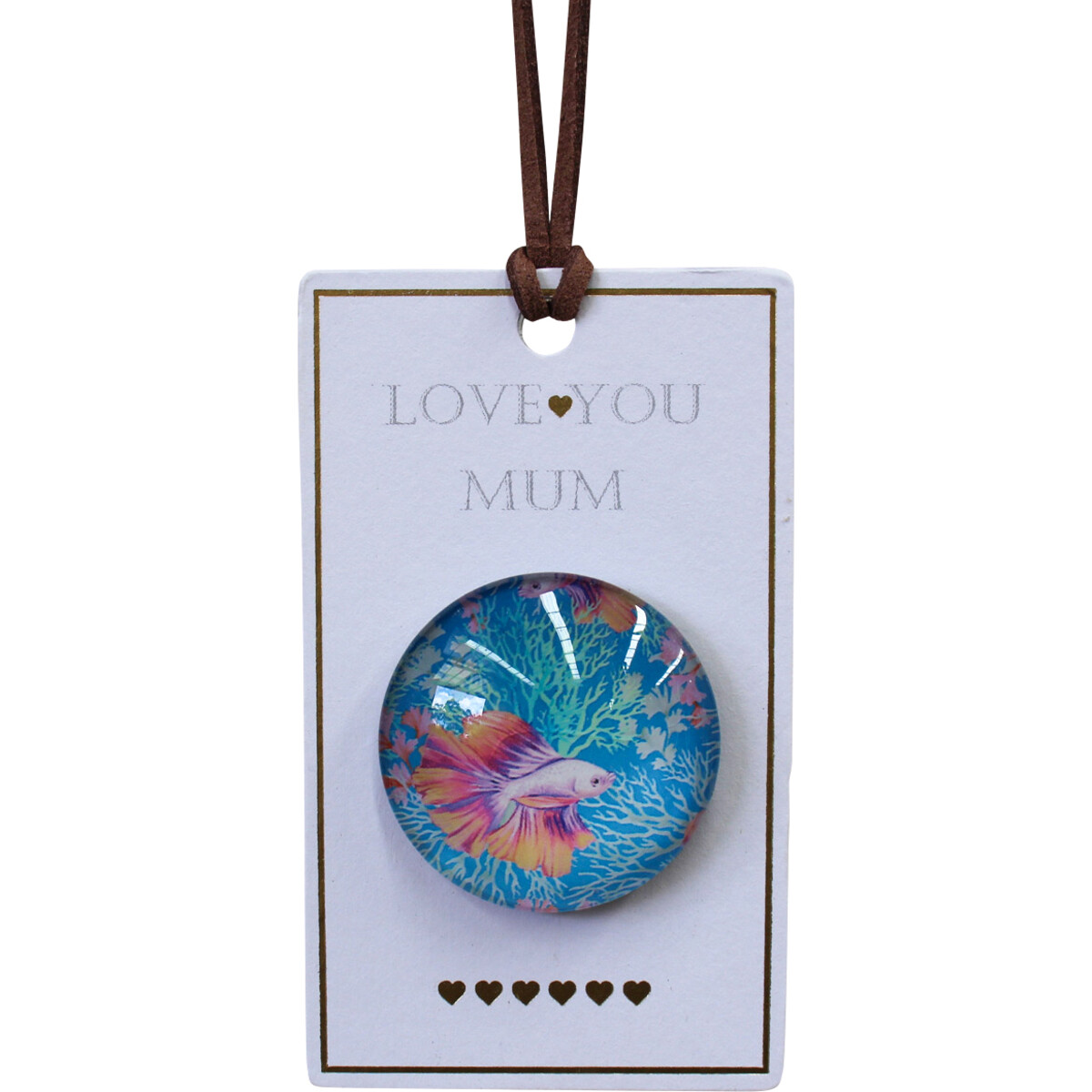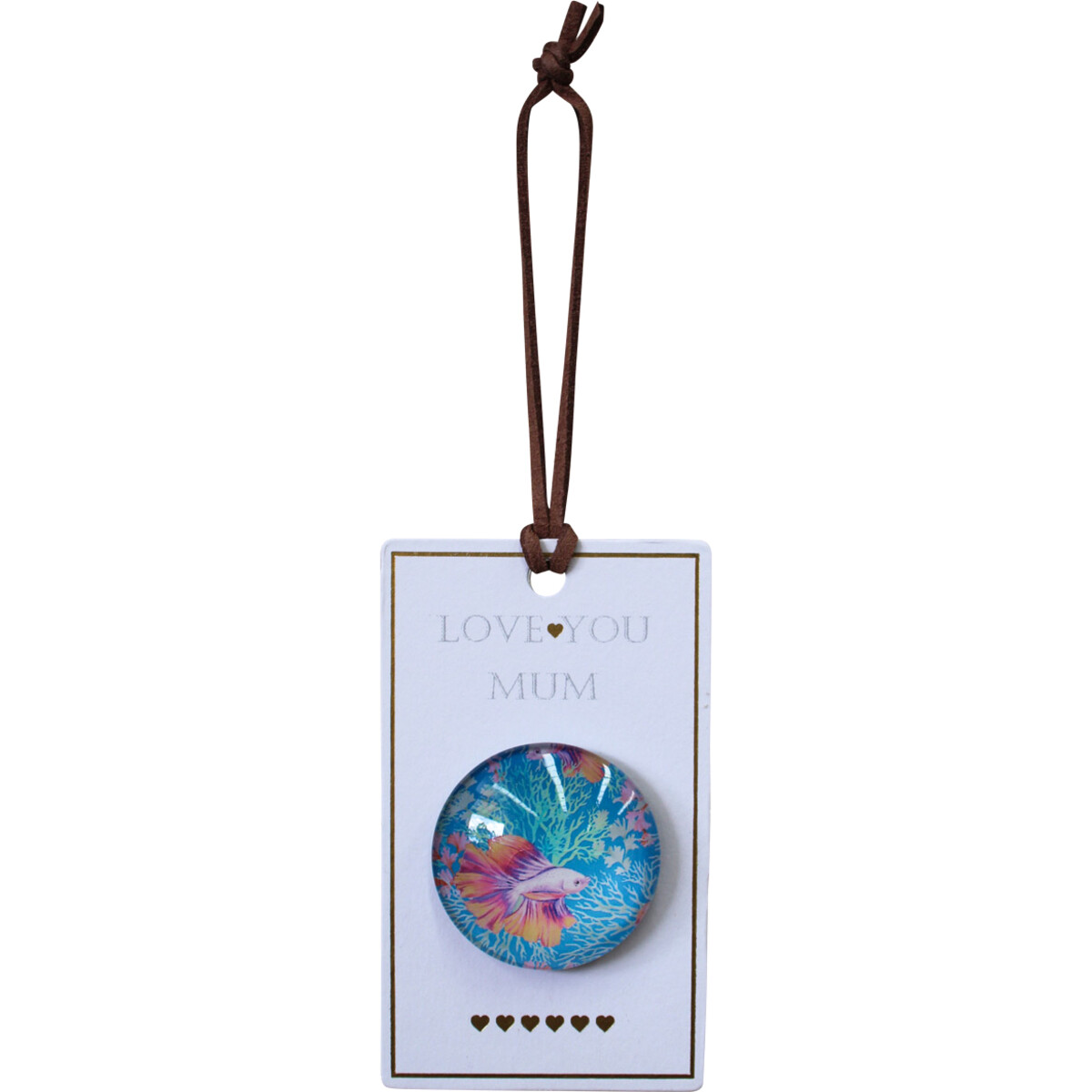 Did you know that the Siamese fish/Betta fish depicted on this décor magnet is also known as "the fighting fish" because of their proclivity to fight? The Gift Magnet Love Mum Siamese decorative magnet is made of crystal clear glass, a powerful magnet, metal and a strong, reliable leather string. Painted on the magnet is the beautiful scenery of a beautiful blue background signifying the sea while the spectacularly beautiful Siamese fishes swim playfully around in it. Unlike our human mothers, the Siamese fighting female fish often lazy around while the aggressively proud and territorial fathers guard the fries/new-borns. This Gift Magnet Love Mum Siamese would be a perfect gift to decorate and bestow our mothers on Mothers' Day and any other time. When they see it, they are constantly reminded of our love.