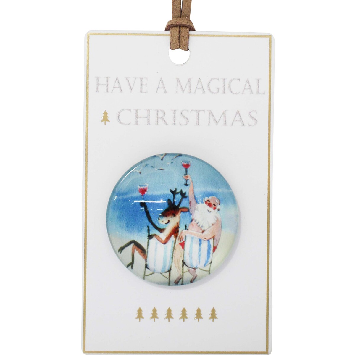 This festive Gift Magnet featuring Rudolf and Santa is a quirky addition that always gets a smile from people who see it in our showroom. We hear so many comments about the little details - the blue sky, the towels, the wine glasses – and we know that's exactly what makes this one so much fun for customers browsing at Christmas time. It's made of glass and metal, with a domed, vintage-style button that gives off a bit of a snow globe effect when you hold it up to the light. We love how it catches on different decor backgrounds, and even though it's small at 5.5x1.5x10cm, it still has decent holding strength for everything from fridge lists to recipes or reminders in the office.