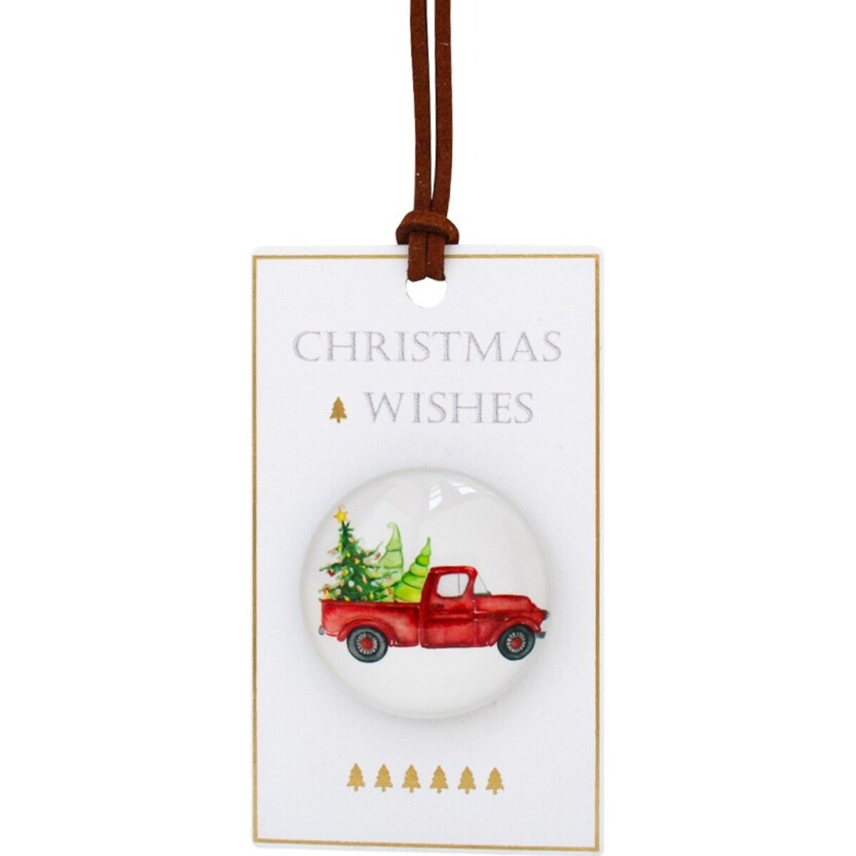 For an enchanting ambience in the home, pair this lovely Christmas wishes with other Christmas embellishments. This piece features Santa clause Ute with decorated Christmas trees riding at the back. Oh, what fun it is to ride in a rusty utility vehicle. This brilliantly coloured piece speaks more than a thousand words, it spreads good cheers. Hang this magnet on the mantelpiece on refrigerators, magnet boards or cubicle. The magnet design is so handy and it is convenient as a holiday gift to a loved one. It can as well be used as a gift tag to compliment Christmas cards. It is finished with a leather rope chosen for its enduring versatility and durability. The leather further beautiful the piece and also makes it handier.
