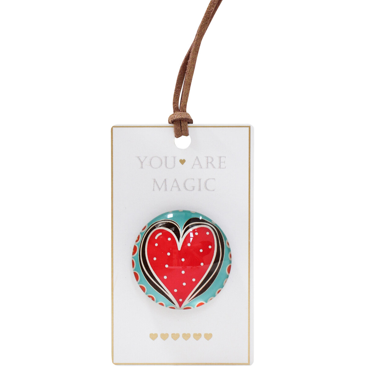 The Gift Magnet You Are Magic Heart possesses a lustre that is both ornamental in various ways as well as practically functional for use in appreciating those who are special to us. It is for this reason that on the top of this magnet is the words which refers to the recipient of this magnet gift as being a magical person. The magnet itself is beautifully ornamented with polychromatic patterns with the love shape occupying the larger portion of this magnet and rendered in bright shade of red. Dotting the bright red are small white dots and framing the exterior edges of this love shape is jet black hue.
